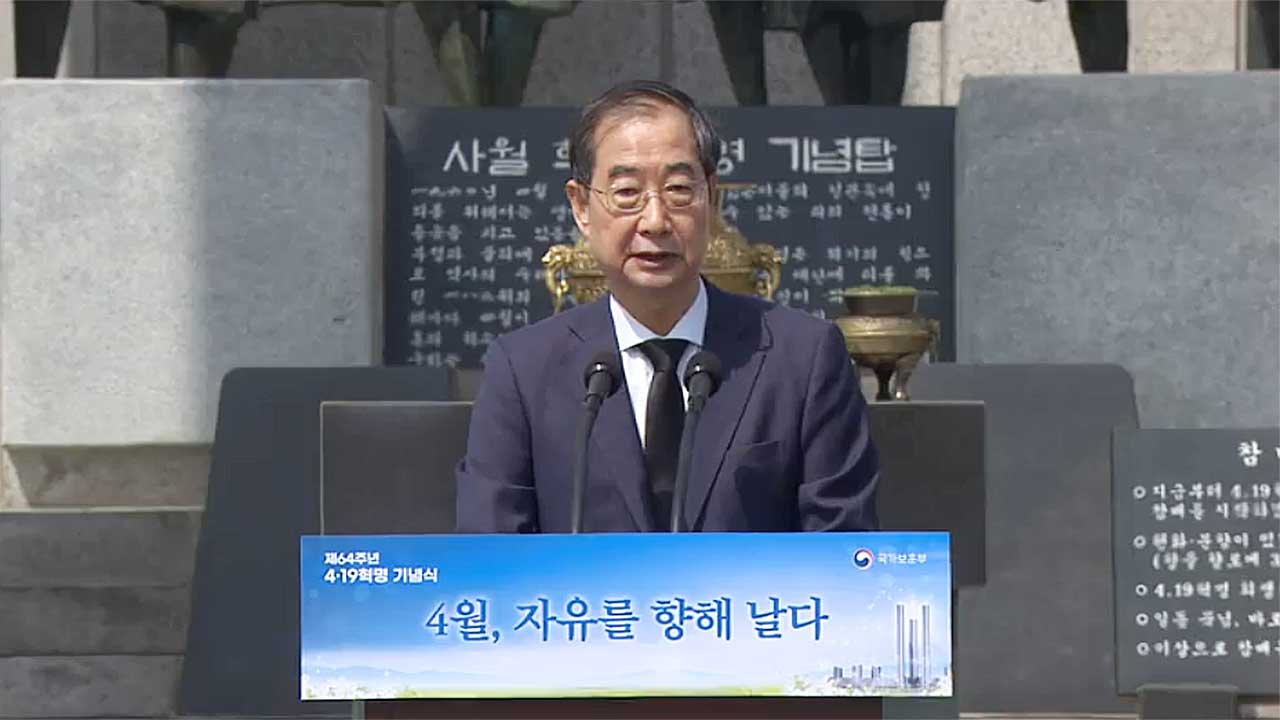 제64주년 4·19 혁명 기념식이 19일 서울 강북구 국립4·19민주묘지에서 거행되었습니다. 국가보훈부 주관으로 열린 기념식에는 4·19혁명 유공자와 가족, 정부 인사 등 1천 5백여명이 참석했습니다. 이날 기념사는 지난 4·10 총선 이후 사의를 표명한 한덕수 국무총리가 연단에 올랐습니다. 한덕수 총리는 기념사에서 "4·19혁명은 학생과 시민의 손으로 이룩한 대한민국 자유민주주의의 분수령이 됐다"라며 "더욱 낮은 자세로 국민의 소리에 귀를 기울이고 자유와 인권, 상식과 공정이 통하는 반듯한 나라를 만드는 데 최선을 다하겠다"라고 말했습니다.