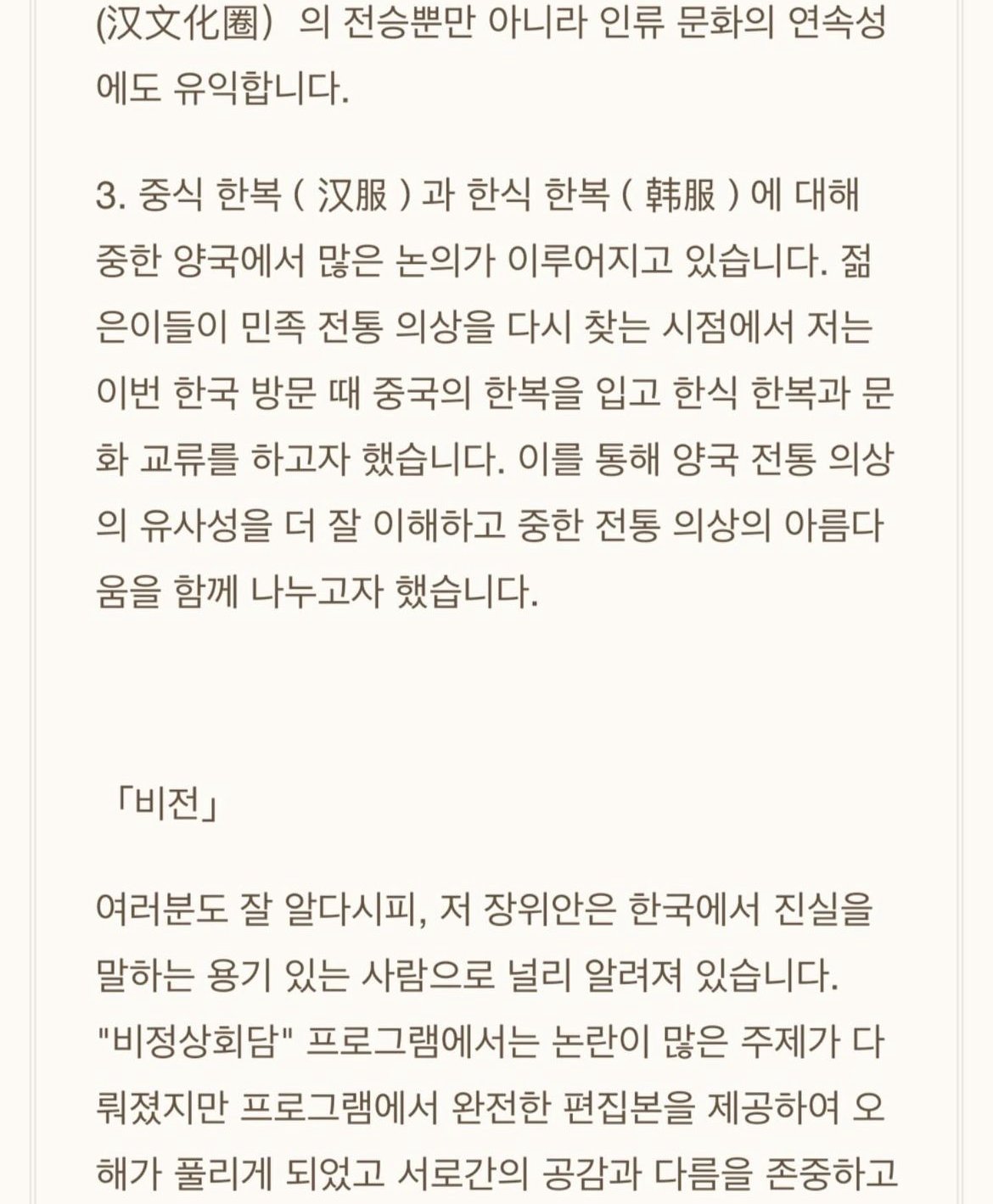여러분도 잘 알다시피, 저 장위안은 한국에서 진실을 말하는 용기 있는 사람으로 널리 알려져 있습니다. "비정상회담" 프로그램에서는 논란이 많은 주제가 다뤄졌지만 프로그램에서 완전한 편집본을 제공하여 오해가 풀리게 되었고 서로간의 공감과 다름을 존중하고 협의하는 분위기가 조성되었습니다. 그러나 이번에는 제 의도가 전달되지 않았습니다. 모두가 보고 듣는 것은 일부분에 상처를 많이 받았습니다. 해당 사건은 제 의도를 벗어난 것이며 제 본래의 의도가 아니었습니다. 이에 대해 여러분의 기분을 해치고, 시간을 낭비했다는 점을 사과 드립니다.