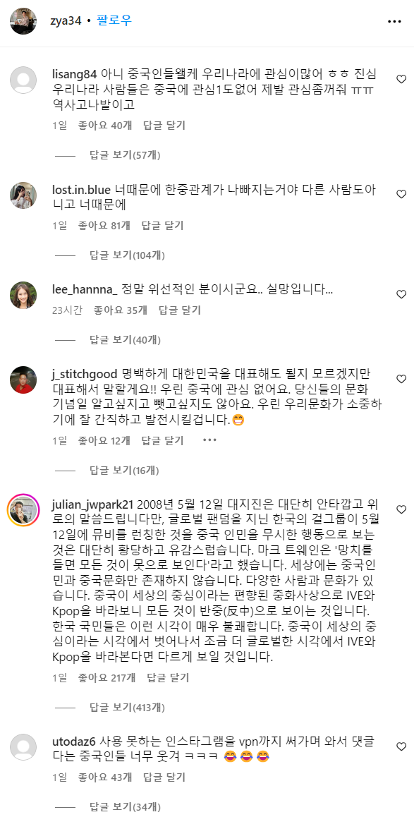 하지만 이에 장위안의 해명과 사과에도 불구하고 한국 네티즌들의 반응은 차갑기만 합니다. 한 네티즌은 그에 사과문에 댓글로 마크 트웨인의 말을 인용하면서 "망치를 들면 모든 것이 못으로 보인다. 세상에는 중국 인민과 중국문화만 존재하지 않는다. 중국이 세상의 중심이라는 편향된 중화사상으로 IVE와 KPOP을 바라보니 모든 것이 반중(反中)으로 보이는 것"이라고 일갈했고, 또 다른 네티즌은 "중국 아티스트들은 그럼 세월호, 5·18 민주항쟁 등 다 피해서 곡 작업을 했던 거냐"고 비난했습니다.
