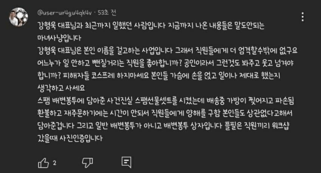 강형욱 대표와 최근까지 일을 했었다고 밝힌 또 다른 네티즌 B씨 역시 댓글을 통해 "지금까지 나온 내용들은 말도 안 되는 마녀사냥"이라며 "강 대표 본인 이름을 걸고 하는 사업이다. 직원들에게 엄격할 수밖에 없다. 어느 누가 일 안 하고 뺀질거리는 직원을 좋아하느냐. 공인이라서 그런 것도 봐주고 웃고 넘겨야 하나"라고 반문했습니다. 게다가 강형욱 대표가 직원들의 명절 선물로 스팸을 배변봉투에 담아줬다는 폭로에 대해선 "(스팸) 배송 중 가방이 찢어지고 파손됐다"며 "환불하고 재주문하기에는 시간이 안 돼서 직원들에게 양해를 구했다. 본인들도 상관없다고 해서 담아준 것"이라고 전했습니다. 또 배변봉투가 아닌 배변봉투 상자"라고 덧붙였죠.