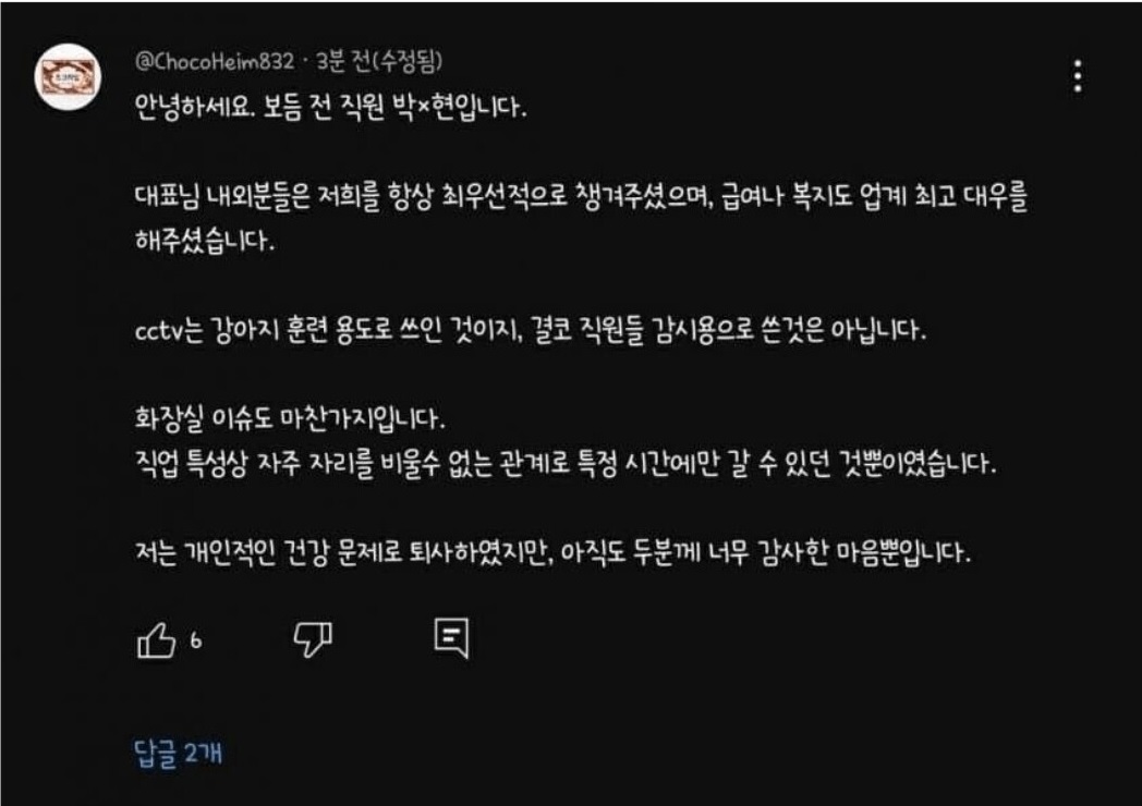 그런데 강형욱 대표를 옹호하는 목소리가 등장하며 사건은 새 국면을 맞이했습니다. 지난 23일 유튜브 채널 '강형욱의 보듬TV'에는 자신을 보듬컴퍼니 전 직원이라고 밝힌 네티즌 A씨가 댓글을 았는데요. A씨는 "대표님 내외는 우리를 항상 최우선으로 챙겨줬으며, 급여나 복지도 업계 최고 대우를 해줬다"면서 CCTV를 설치해 직원들을 감시했다는 주장에 대해선 "CCTV는 강아지 훈련 용도로 쓰인 것이지, 결코 직원들 감시용으로 사용된 것이 아니다"고 반박했고, 직원들의 화장실 이용을 제한했다는 의혹에 대해서도 "직업 특성상 자주 자리를 비울 수 없는 관계로 특정 시간에만 갈 수 있던 것뿐이었다"고 설명했습니다.
