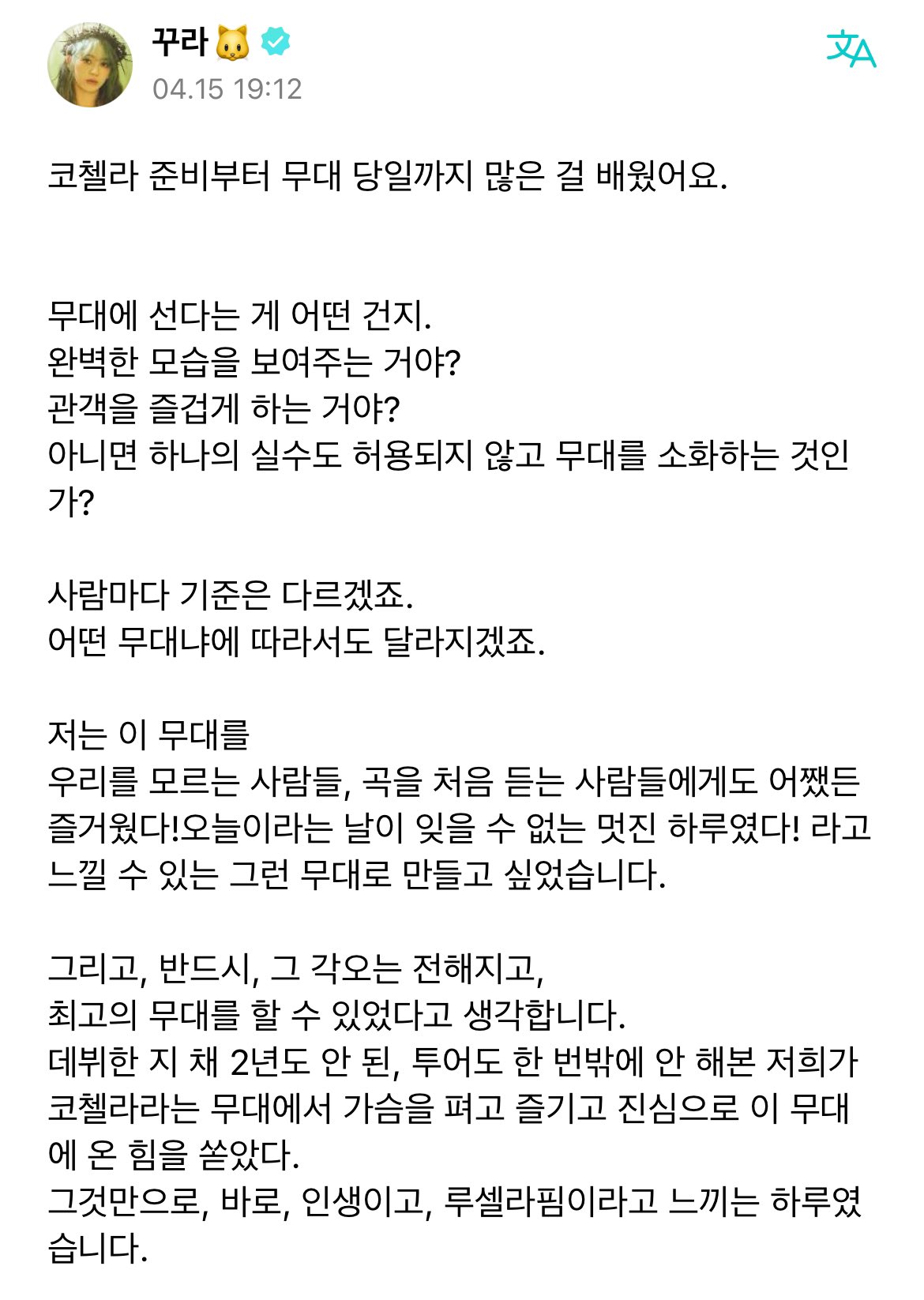 "무대의 기준은 사람마다 다를 거다. 저는 르세라핌을 모르거나 저희 노래를 모르는 사람이 봐도 정말 재미있다고, 잊을 수 없는 무대였다고 느낄 수 있는 코첼라 무대를 만들고 싶었다"면서도 "최고의 무대가 됐다고 생각한다. 저희는 진심으로 즐기며 코첼라에 전력을 쏟았다. 우리가 보여준 무대 중 최고의 무대였다는 것은 흔들리지 않는 사실"이라는 사쿠라의 자위는 성장형 아이돌이라고 믿고 응원하던 많은 사람들에게 어느새 사쿠라도 나르시시즘에 빠진 '고인물'이 다 됐다는 것을 보여줬습니다.