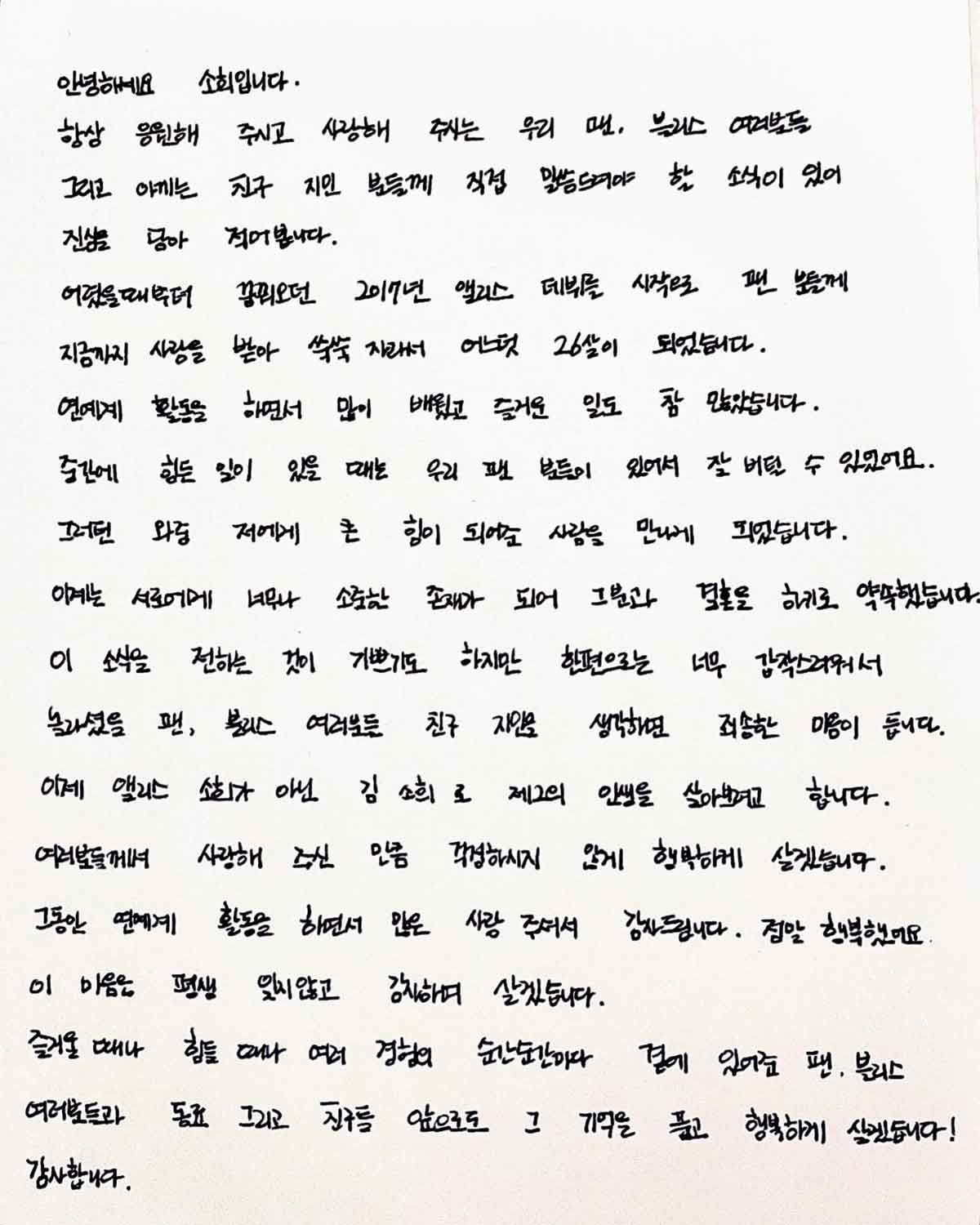 이제는 서로에게 너무나 소중한 존재가 되어 그분과 결혼을 하기로 약속했습니다. 이 소식을 전하는 것이 기쁘기도 하지만 한편으로는 너무 갑작스러워서 놀라셨을 팬, 블리스 여러분들 친구 지인을 생각하면 죄송한 마음이 듭니다. 이제 앨리스 소희가 아닌 김소희로 제2의 인생을 살아보려고 합니다. 여러분들께서 사랑해 주신 만큼 걱정하시지 않게 행복하게 살겠습니다. 그동안 연예계 활동을 하면서 많은 사랑 주셔서 감사드립니다 정말 행복했어요. 이 마음은 평생 잊지 않고 감사하며 살겠습니다!