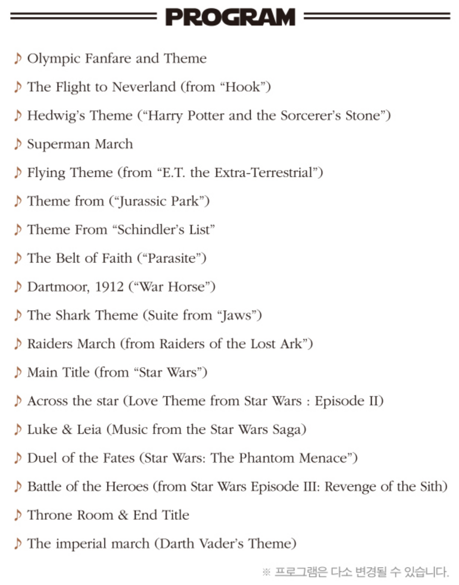 이번 공연의 타이틀이었던 '월드 유니온 오케스트라 슈퍼클래식'에도 할 말이 많습니다. 이번 콘서트는 총 3개의 주제로 구성되었습니다. 19일과 20일 서울 예술의전당과 롯데콘서트홀에서 있었던 '월드 유니온 오케스트라 슈퍼클래식: 존윌리엄스 스타워즈'는 영화음악의 거장 존 윌리엄스가 만든 '해리포터' 'E.T''슈퍼맨''쥬라기 공원' '죠스' 등의 OST 그리고 '스타워즈'의 OST으로 구성되었습니다. 23~24일 KSPO DOME(올림픽 체조경기장)에서 예정된 ' 월드 유니온 오케스트라 슈퍼클래식: 김호중&프리마돈나'는 공연 프로그램이 공개조차 되지 않았고, 마지막으로 25일 경기아트센터 대극장에서 예정된 '월드 유니온 오케스트라 슈퍼클래식: 영화음악 콘서트'는 '시네마 천국' '쉰들러리스트' '스타워즈' 등의 OST와 푸치니의 오페라 수록곡 등으로 구성되었습니다.
