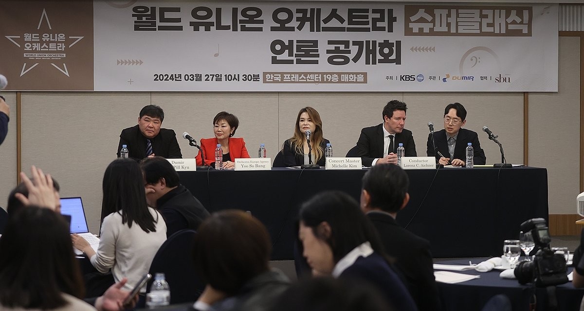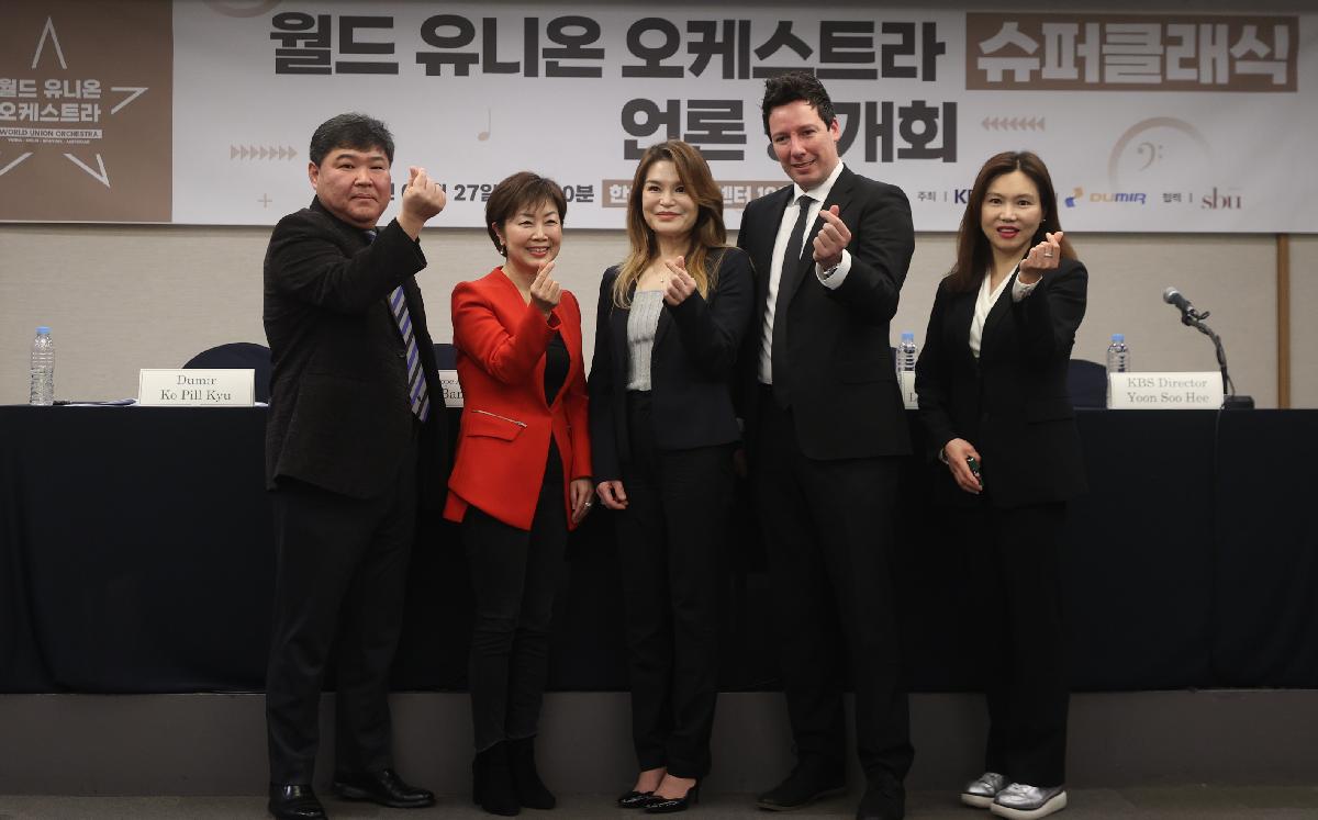 지난 3월 27일 서울 중구 한국프레스센터 매화홀에서 있었던 '월드 유니온 오케스트라 슈퍼클래식' 언론공개회로 가보겠습니다. 이 자리에는 오페라 전문 지휘자 로렌츠 아이히너, 뉴욕 필하모닉 부악장 미쉘 김, 유소방 sbu 대표, 고필규 두미르 대표 등 관계자 등이 참석해 5월에 진행될 '월드 유니온 오케스트라 슈퍼클래식'에 대해 소개하는 자리였습니다.