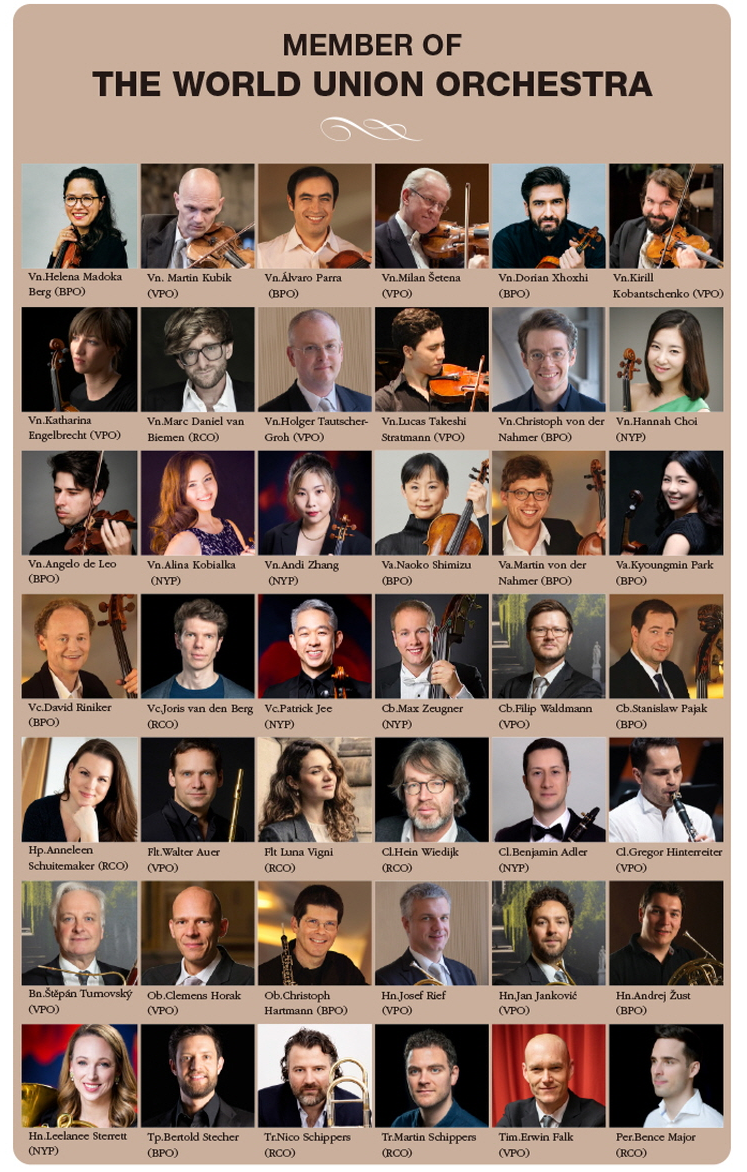 언론공개회 이후 매체들을 통해 보도된 내용에 의하면 '월드 유니온 오케스트라'는 세계 최정상 4대 오케스트라의 악장과 수석, 핵심 정단원들을 중심으로 구성되었으며, 각 오케스트라의 규정상 최대 13명을 넘지 않도록 제한된 규정에 근거해 조직됐기에 국내 대표 오케스트라의 일부 현역 단원도 객원으로 충원될 예정이라고 되어 있었습니다.