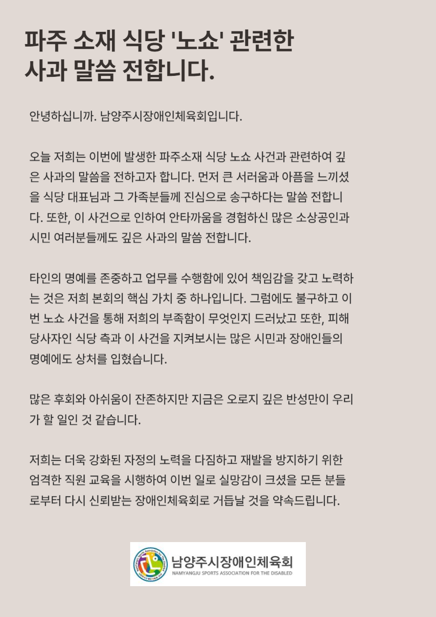 보도에 의하면 남양주시장애인체육회는 지난 3월 경기도 파주시 문산읍의 한 식당에 100명의 식사 가능 여부를 문의했습니다. '제14회 경기도장애인체육대회 2024 파주'에 출전한 장애인 선수단 및 관계자 등을 격려하기 위해서였죠. 식당 사전답사를 마친 체육회 관계자들은 4월 26일 오후 6시로 100명 분 식사 예약을 마쳤습니다.
