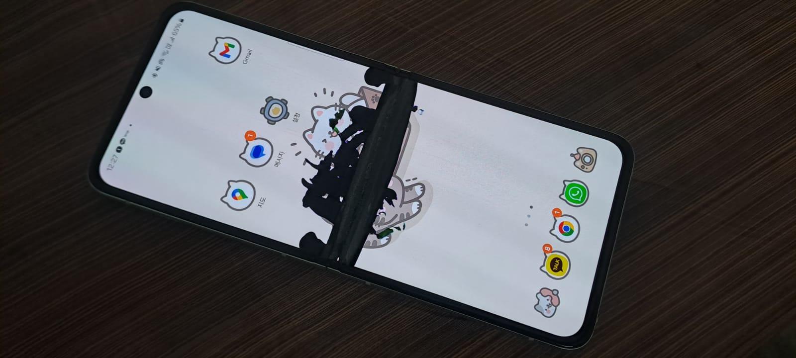 그 이후 2023년 10월, 화면이 접히는 부분에 금이 간 것처럼 줄이 생기더니 돌연 까맣게 변해버리고선 터치가 되지 않더군요. 검색해보니 바로 'Z플립 중앙선 게이트'. 짜증나긴 했지만, 그간 몇 차례 떨어뜨린 적도 있고 해서 한화 약 50만원을 내고 액정패널 및 힌지 등을 유상교체했습니다. 참고로 인도에서 스마트폰 보증기한은 1년에 불과합니다.