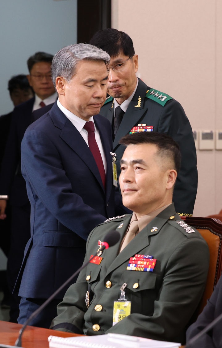 청문회 시작 전 이종섭 전 국방부 장관이 출석하자 임선근 전 해병대 1사단장과 임기훈 전 대통령실 국방비서관은 자리에서 벌떡 일어나 고개를 숙여 인사를 했습니다. 이에 반해 박정훈 전 해병대수사단장은 자리를 지키고 그대로 앉아 있어 눈길을 끌었죠.