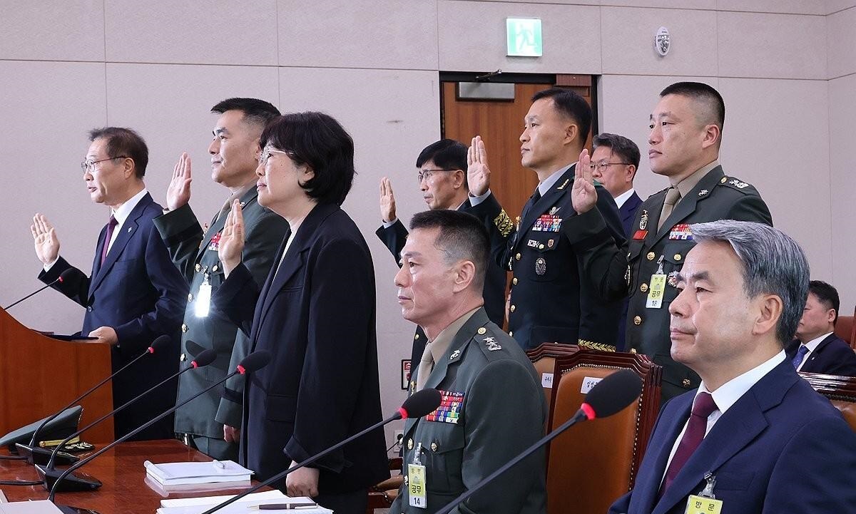 청문회 시작 직후 있었던 증인 선서에서 이종섭 전 국방부 장관과 신범철 전 국방부 차관, 임성근 전 해병대 1사단장은 증인 선서를 거부했습니다. 박성재 법무부 장관이 증인 대표로 발언대에 서 "양심에 따라 숨김과 보탬이 없이 사실 그대로 말하고 만일 진술에 거짓이 있으면 위증의 벌을 받기로 맹세한다"고 말하고, 나머지 증인들이 자리에서 일어나 선서에 동참하는 동안 이종섭·임성근·신범철 세 명은 묵묵히 자리를 지키고 앉아있었죠.