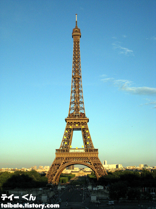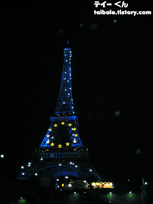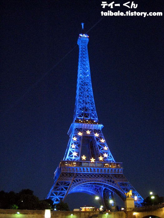이 사진은 세느강 유람선을 타고 찍은 에펠탑입니다. 야경을 볼 수 있는 첫번째 바토무슈를 타게 되었죠..ㅎㅎ 원래 에펠탑은 밤이 되면 조명을 켜 금색으로 변하죠. 그런데 2008년 6월 30일부터 약 2달간 이렇게 파란색이었습니다. 왜냐구요? 프랑스가 유럽연합의 순회의장국이 되고, 사르코지 프랑스 대통령이 유럽연합 순회의장이 된 것을 기념해서 유럽연합 국기를 상징하는 파란색 불을 밝힌 것이랍니다. 외무부 장관 베르나르 쿠쓰네르가 30일 밤 11시 전등 점화식을 했고, 파리의 '철의 여인'인 에펠탑은 12개의 별이 박힌 파란색 바탕의 옷을 갈아입게 되었죠.