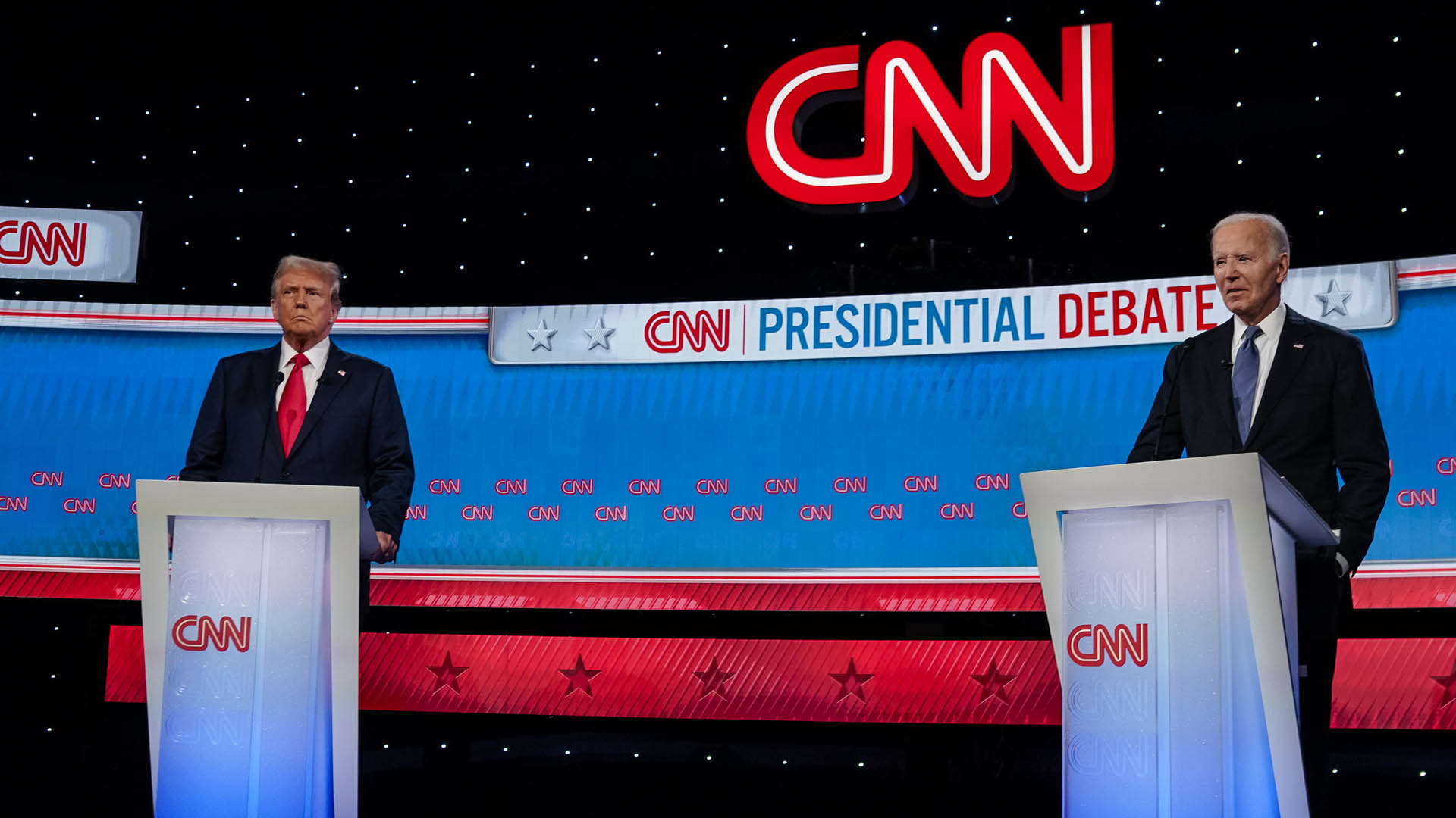 토론을 시작하기 전 악수조차 나누지 않은 두 사람에게서는 팽팽한 긴장감이 흘렀습니다. 그도 그럴 것이 26일 뉴욕타임스(NYT)가 대선 후보 대상 전국 여론조사 지지율 평균을 분석한 결과 두 후보가 모두 46%로 동률을 이뤘기 때문이죠. 그나마 지난 9개월동안 트럼프 전 대통령에게 미세하게 열세를 보이던 바이든 대통령이 지난 3월 대선 출정식이라도 봐도 무방할 수준의 국정연설을 계기로 조금씩 추격을 시작해 최근 트럼프 전 대통령이 '성추문 입막음 혐의'로 유죄 평결을 받은 후 격차를 더욱 좁혔죠.