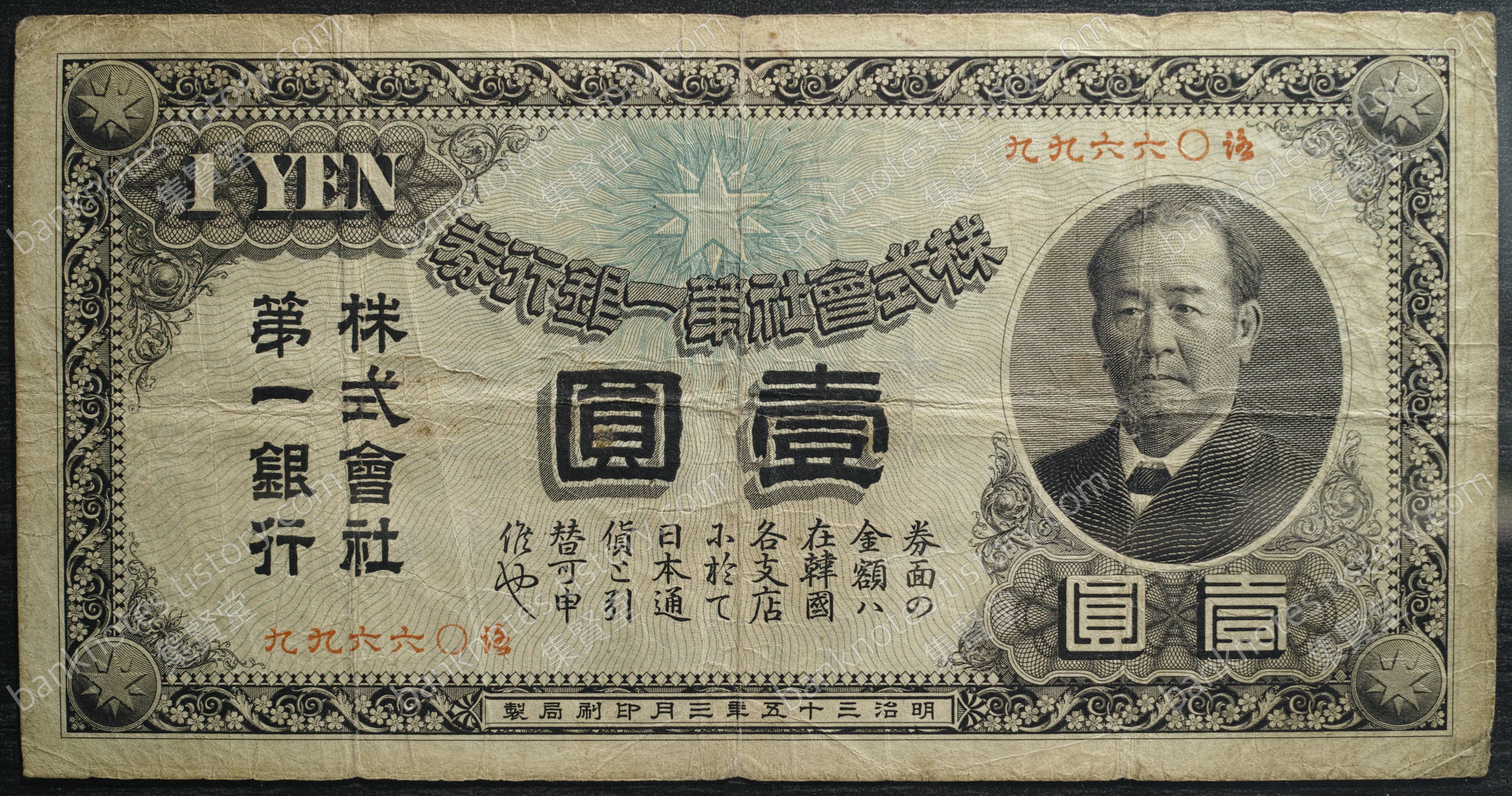 이러한 상황에서 환전과 자금 회전에 어려움을 겪던 일본 상인들은 이미 대한제국에 지점을 설치하고 있던 일본 제일은행 발행 화폐의 한반도 유통을 본국에 요청했고, 1902년 일본 정부는 일본 제일은행권의 발행, 유통을 허가합니다. 이는 대놓고 대한제국 화폐 주권을 침해하는 행위로 대한제국 정부와 상인들에 대한 도전이었고, 제일은행권 배척 운동이 전개됐지만, 일본은 이에 대한 무력시위를 하며 제일은행권 발행을 강행했습니다. 바로 이때 발행된 제일은행권에 들어갔던 인물이 시부사와 에이이치. 120여 년이 지나 일본의 화폐에 다시금 얼굴을 비추게 된 인물입니다.
