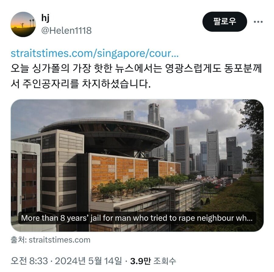싱가포르 역사상 최초로 일본인 남성에게 징역형과 함께 '태형'이 선고됐습니다. 지난 1일 싱가포르 고등법원은 술취한 20대 여대생을 성폭행한 후 이를 촬영한 일본인 키타 이코(38)에게 징역 17년6월과 태형 20대를 선고했습니다.