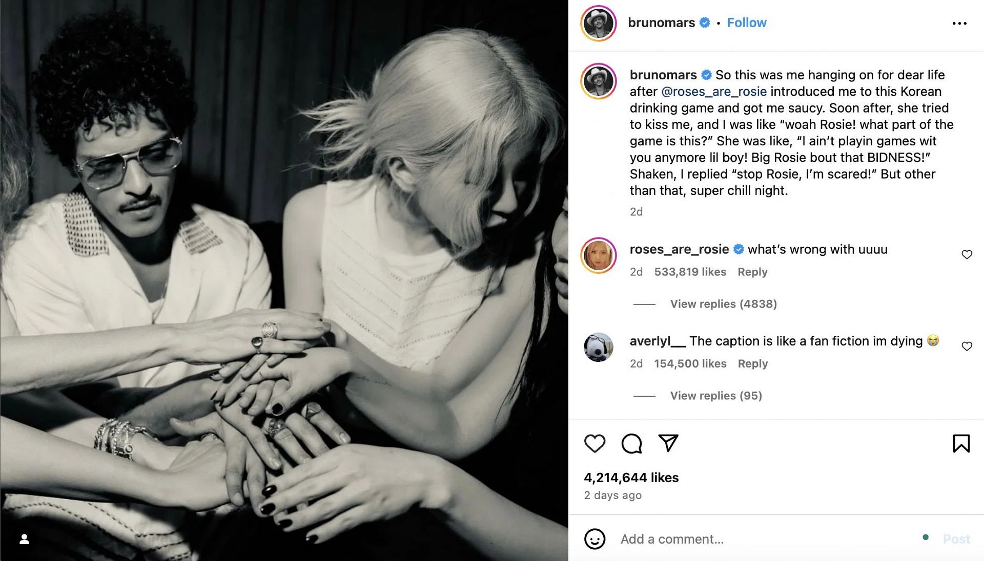 지난 18일 발매된 블랙핑크 로제와 브루노 마스의 싱글 'APT.'(아파트)가 전 세계를 씹어먹고 있습니다. '아파트'는 오는 12월 6일 앨범 'rosie' 발매를 통한 정식 컴백을 앞두고 발매된 선공개 싱글로, 술게임 중 하나인 '아파트 게임'에서 착안한 곡입니다. 게임의 리듬감을 그대로 살린 멜로디 라인과 '아파트 아파트'라는 가사가 강한 중독성을 자랑하죠.