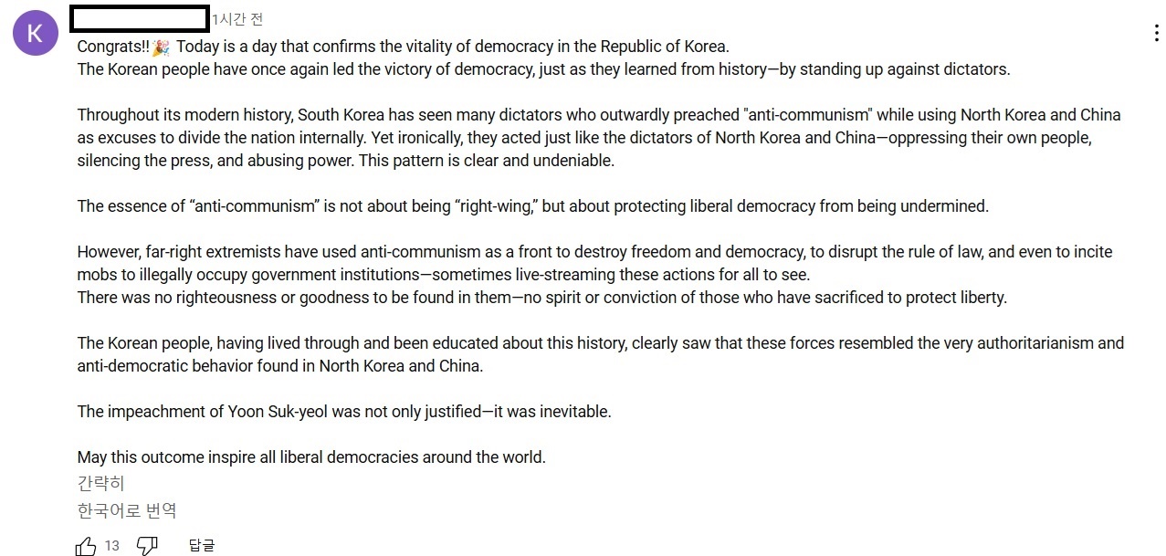 한편 외신들은 한국이 헌정사 두 번째로 맞이한 대통령 파면 소식을 앞다투어 보도했습니다. 전세계 네티즌들은 "축하를 건넨다! 오늘은 대한민국 민주주의의 생명력이 다시 한 번 확인된 날" "대한민국 국민은 역사가 가르쳐준 대로, 독재에 맞서 싸우며, 다시 한 번 민주주의의 승리를 이끌어냈다" "윤석열의 탄핵은 정당했을 뿐 아니라, 불가피한 일이었다" "이번 탄핵심판의 결과가 전 세계 자유민주주의 국가들에 깊은 영감을 주길 바란다" "세상 어딘가에서 민주주의가 제대로 작동하고 있는 모습을 보니 정말 반갑다!" 등의 반응을 보이며 이번 파면으로 한국이 세계 민주주의의 모범이 됐다고 평가했죠.