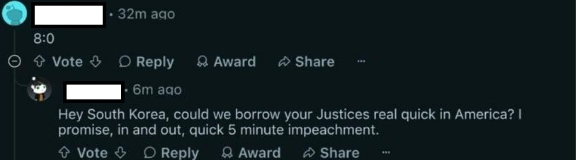 특히 미국 네티즌들의 반응은 상당히 흥미로웠습니다. 미국 네티즌들은 윤석열 전 대통령의 파면과 관련해 "미국이여, 메모하라. (탄핵은) 이렇게 하는 것이다"라며 미국의 각성을 요구하는가 하면 "트럼프가 다음 차례" "2021년 1월 6일의 미국 의회의사당 폭동과 관련하여 군사법정에서 트럼프를 기소해야 한다" "저기 한국, 너희 재판관들 미국에 잠깐만 빌려주면 안 될까? 진짜 딱 5분 만에 탄핵하고 바로 돌려줄게" 등의 반응을 보이기도 했죠.