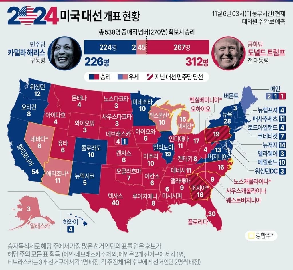 도널드 트럼프 전 미국 대통령이 2024 미국 대선에서 승리하며 2기 집권을 확정했습니다. 트럼프 전 대통령은 현지시각으로 6일 대선 승리 '매직 넘버'인 선거인단 270명을 달성했습니다. 미국의 대선은 주별 투표 결과를 토대로 선출된 선거인단이 대선 후보를 뽑는 간접 선거 방식을 채택하고 있는데요. 총 538명의 전국 선거인단 중 과반인 270명을 확보하는 후보가 최종 승자가 되는 방식입니다.