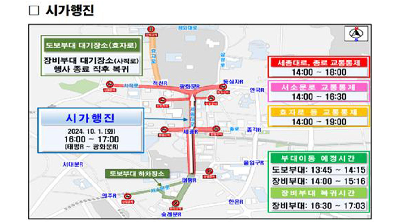 시가행진을 위해 서울 도심을 비롯해 동남권 일대 도로에서는 교통통제가 이뤄졌습니다. 서울경찰청은 시가행진 행사로 인해 군 병력 수송 버스와 K2전차 등 기갑 장비부대가 이동하는 오후 1시 40분부터 오후 3시 20분까지 서울공항부터 헌릉로∼양재대로∼동작대로∼현충로∼한강대로에 이르는 진행 방향 전 차로를 통제했죠. 또한 시가행진 구간인 세종대로 숭례문에서 광화문까지는 오후 2시부터 오후 6시까지 양방향이 통제됐습니다. 교통통제는 시가행진이 마무리되는 오후 4시 30분 서소문로를 시작으로 오후 7시까지 순차적으로 해제될 계획입니다.