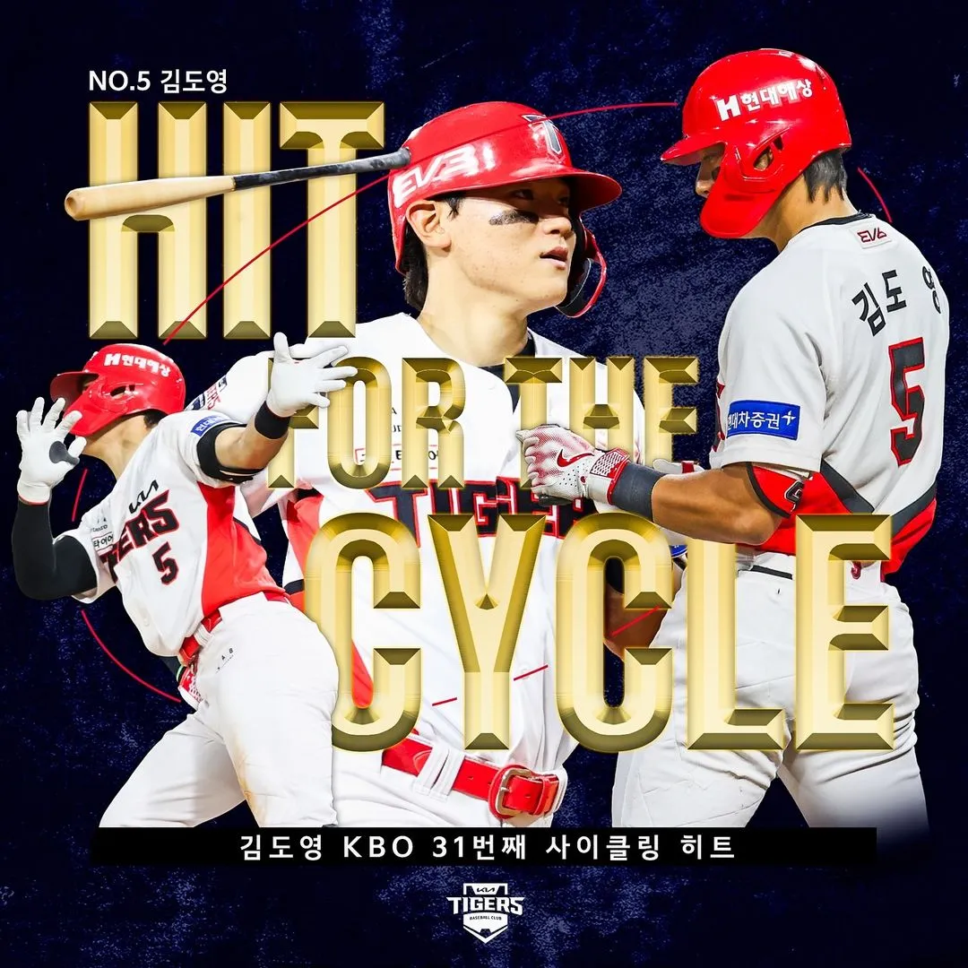또한 7월 23일, 광주 NC전에서 김도영은 단타-2루타-3루타-홈런을 순서대로 때리며 최소 타석 내추럴 사이클링 히트를 달성했습니다. 1996년 프로야구 사상 첫 사이클링히트를 기록한 롯데 자이언츠의 김응국조차도 타석 중간에 아웃이 끼어 있었는데, 김도영의 '4타석 내추럴 사이클링 히트'는 그야말로 프로야구 역사상 처음 세워진 대기록.