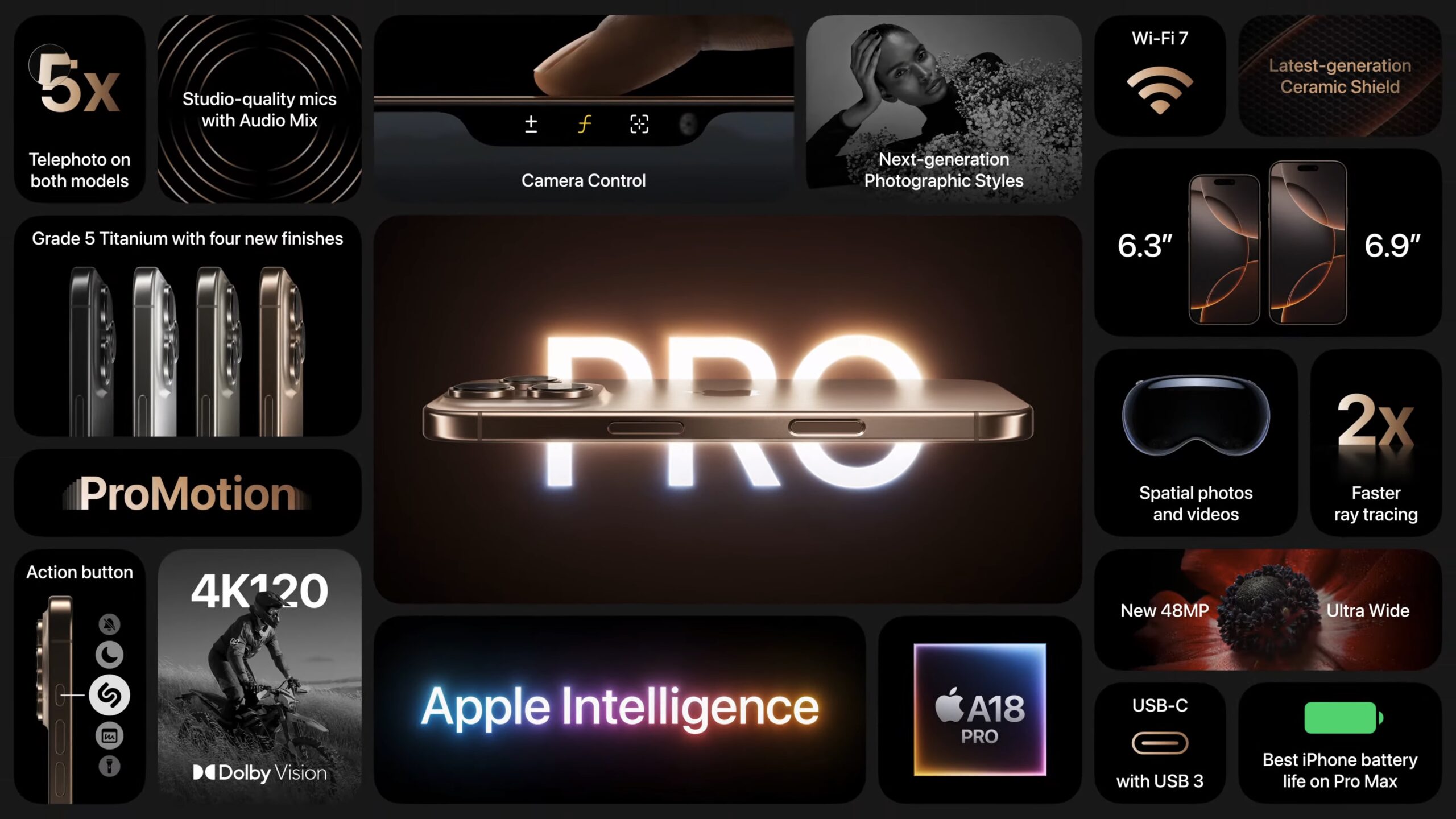 애플이 자체 개발한 최신 칩 A18과 A18프로가 장착된 애플 인텔리전스는 이모티콘 생성, 녹음 및 번역, 사진 찾기, 메일 요약 등을 제공하고, 애플 음성 비서 시리(Siri)는 중간에 말이 끊겨도 이용자 언어를 이해하고 답을 제공하는 등 단계별 방법도 안내해 줄 예정이지만, 세계 최초로 스마트폰에 AI를 입힌 삼성전자 갤럭시 S24 시리즈 등 경쟁사 AI 스마트폰과 기능적인 면에서 크게 다르지 않다는 평가가 지배적입니다. 애플에 우호적인 현지 언론인 블룸버그 통신조차 "이날 발표에서 놀라운 일은 거의 없었다"고 평가했습니다.