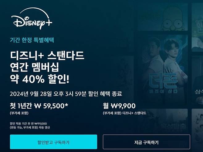 우선 디즈니플러스를 살펴보겠습니다. 21일 디즈니플러스는 오는 28일까지 스탠다드 멤버십의 연간 구독료를 기존 9만9,000원에서 약 40% 할인된 가격인 5만9,500원에 판매하는 프로모션을 진행한다고 밝혔습니다. 신규 가입 고객 및 현재 유효 멤버십이 없는 재구독자 적용 대상. 디즈니플러스의 스탠다드 멤버십은 구독료 월 9,900원에 광고 없이 1080p 화질을 지원하며, 동시 접속 기기는 2대로 제한되는 구독 프로그램인데, 해당 프로모션을 적용하면 월 구독료는 4,900원으로 낮아집니다.