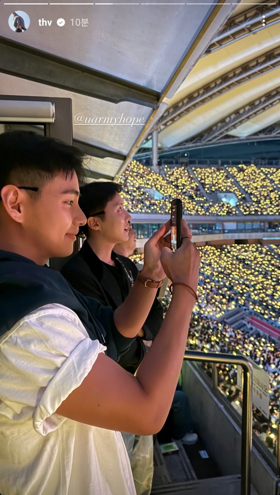 이날 아이유의 공연에는 방탄소년단(BTS)의 멤버 뷔와 제이홉이 방문해 공연을 관람하기도 했습니다. 뷔는 22일 자신의 인스타그램에 여러 장의 사진과 함께 군 휴가 근황을 전했죠. 아이유의 계정을 태그하며 "100번째 공연 축하해요"라는 메시지를 남긴 뷔는 군 입대 전 아이유의 '러브 윈즈 올(Love wins all)' 뮤직비디오 출연했던 비하인드 사진을 공개하며 아이유와의 인연을 되새겼습니다.