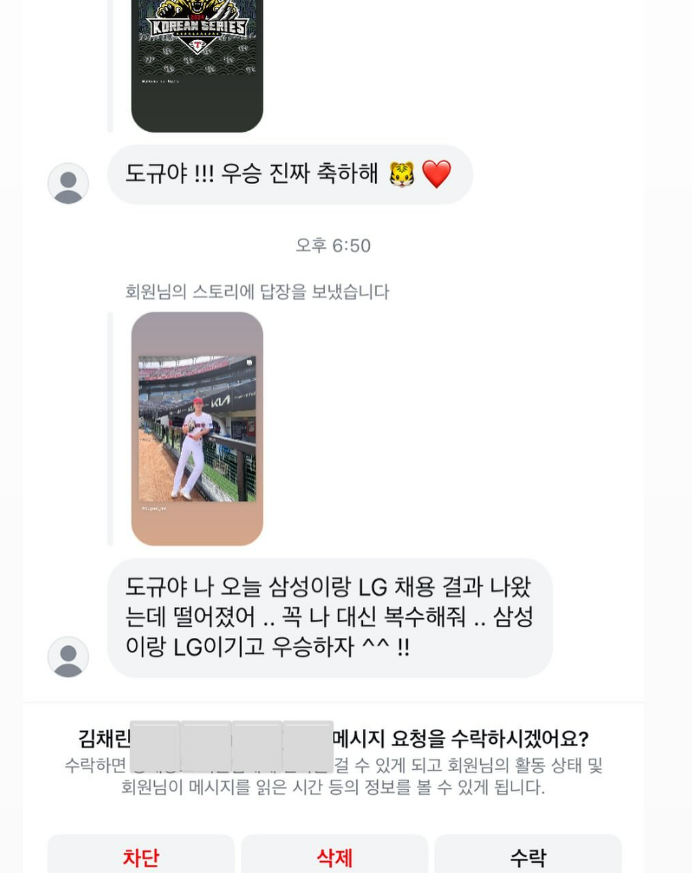 5차전의 세 번째 투수로 등판해 무실점으로 삼성의 공격을 막아낸 곽도규의 인스타그램 답변도 화제가 됐습니다. 작년에 고등학교를 졸업한 후 KIA에 입단한 2004년생 곽도규는 그야말로 'MZ'중의 MZ죠. 한 팬이 곽도규에게 "나 오늘 삼성이랑 LG 채용 결과 나왔는데 떨어졌다"며 "꼭 나 대신 복수해달라. 삼성(라이온스)이랑 LG(트윈스) 이기고 우승하자"고 DM을 보냈는데, KIA가 우승을 확정한 뒤 곽도규는 "누나 내가 해냈어"라며 해당 팬이 보낸 메시지를 공개했습니다.