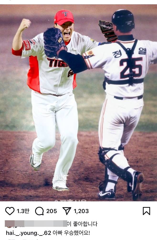 KIA의 마무리 투수 정해영은 이날 '부자(父子) 최초 동일팀 한국시리즈 우승'이라는 감격적인 기록을 세웠습니다. 정해영의 아버지는 해태 타이거즈 우승 포수 출신인 정회열 동원대 감독이죠. 두 사람은 이미 ' 부자 최초 동일팀 1차 지명 입단'이라는 기록을 세운 바 있는데요. 정해영은 29일 자신의 인스타그램에 1993년 아버지의 우승 확정 순간을 담은 사진과 자신의 사진을 합성한 사진을 업로드했는데, 31년이라는 시간과 공간을 뛰어넘어 그 어떤 가족들도 쉽게 가질 수 없는 감동적인 순간에 많은 팬들이 호응을 보냈죠.