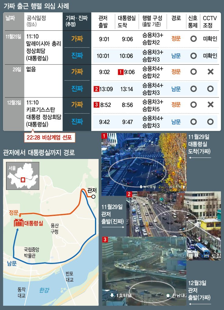 대통령 출퇴근 경호 업무를 맡은 경찰에 따르면 이 '가짜 부대'를 일컫는 별도의 경찰 음어가 존재할 정도라고 합니다. 한겨레가 지난 11월 6일부터 12월 6일까지의 기간 중 주말과 외국 순방 기간을 제외한 18일에 대해 윤석열 대통령의 출근 상황을 확인한 바에 의하면 위장 출근이 의심되는 사례는 최소 3번. '가짜 부대'가 움직일 때는 차량 통제에 나선 경찰들이 서로 잡담을 나누며 도로를 주시조차 하지 않았고, 실제 출근이 이루어질 때는 관저 방향으로 걷는 행인들을 모두 검문하거나 관저 진입·출입로 주변 행인·차량들을 철저히 살폈다고 합니다. 경찰의 철수도 이 두 번째 '진짜 부대'의 이동 이후 이루어졌죠.