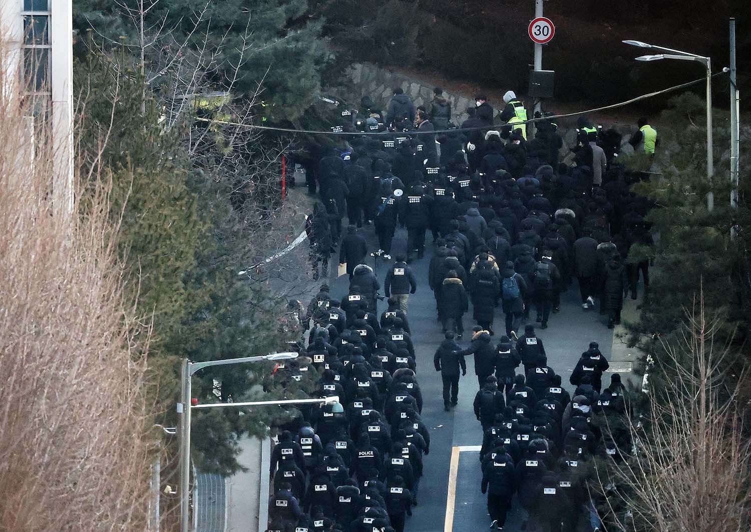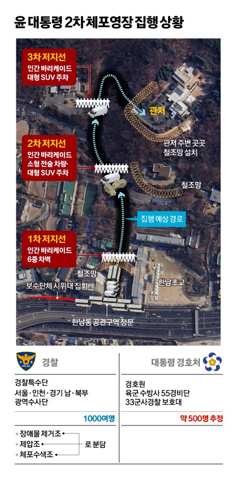 5시 50분경 정문 앞 바리케이드가 제거됐고, 철제 사다리를 타고 5중 버스 차 벽을 넘고 철조망을 절단기로 잘라내가며 끝내 7시 34분 1차 저지선을 돌파합니다. 지난 1차 집행 당시 1~3차 저지선을 막아선 육군 수도방위사령부 55경비단 소속 병력도 없었기에 체포팀은 그길로 500m 위에 위치한 관저로 향했고, 7시 48분 2차 저지선을 통과한 뒤 산길로 우회, 7시 57분 3차 방어선인 대통령 관저 정문에 도착합니다.