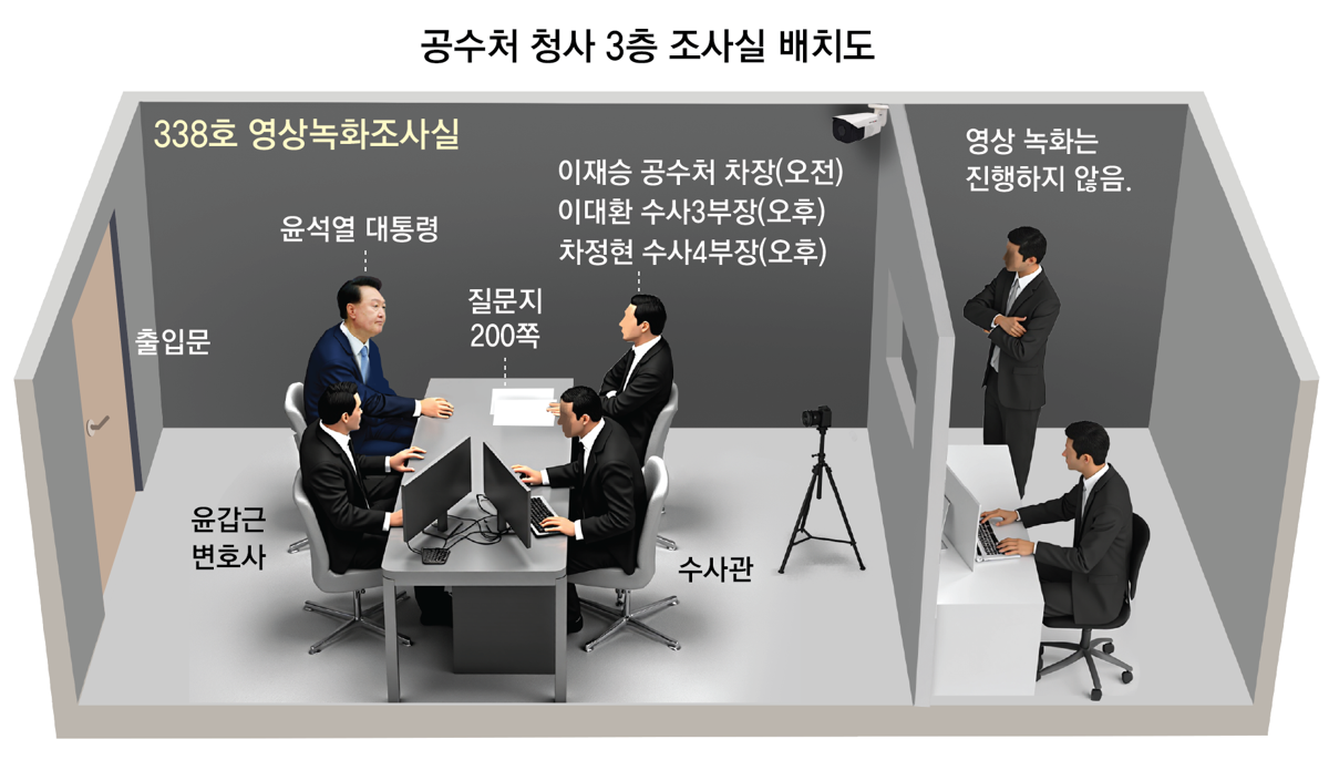 애초 공수처는 조사에 대한 영상녹화를 위해 338호 영상녹화조사실에서 피의자 조사를 시작했지만, 윤 대통령의 거부로 영상녹화없이 조사를 진행했습니다. 조사는 공수처의 2인자인 이재승 차장검사가 직접 맡았고, 윤 대통령은 윤갑근 변호사의 조력을 받았죠. 윤 대통령은 "수사권이 없는 공수처가 위법 수사를 진행하고 있다"는 입장을 유지하며 진술 거부로 일관했다고 합니다.
