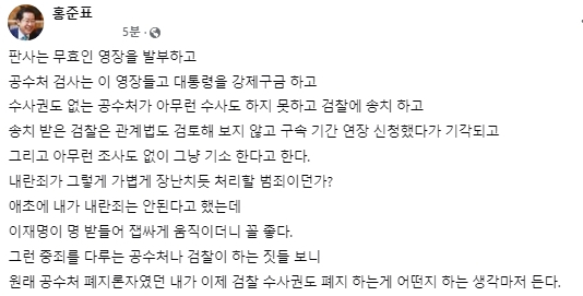 김기현 국민의힘 의원은 "내란죄에 대한 수사권이 없는 공수처가 현직 대통령에 대해 불법수사, 불법체포를 하였다는 점이 점점 명확히 드러나고 있다. 이것이야말로 국헌을 문란하게 한 내란범죄"라고 주장하며 "불법체포, 불법수사를 한 공수처는 즉각 해체하고, 그 수괴인 공수처장을 구속시켜야 한다. 또한 불법적인 체포영장을 발부했던 서부지방법원 판사에 대하여도 구속수사를 해야 한다. 또한 이런 내란행위를 기획해 선동하고 나아가 지휘·감독까지 한 이재명 대표와 민주당도 내란죄 수괴혐의로 처벌해야 한다"고 목소리를 높였습니다.