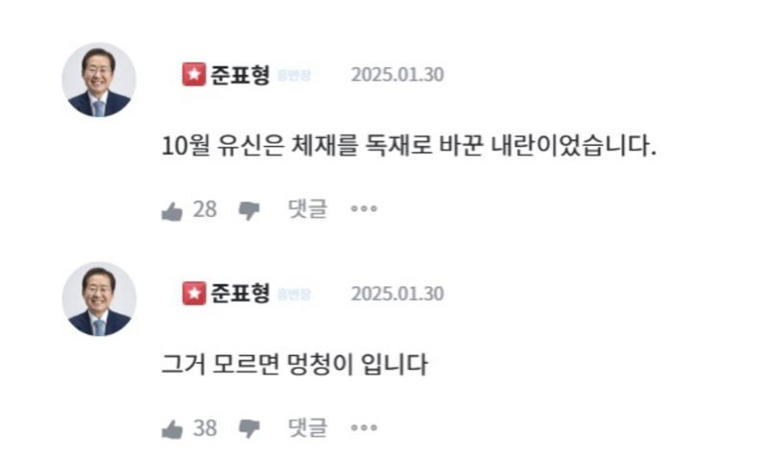 방송 이후 홍준표 시장의 소통채널인 '청년의 꿈'에 한 지지자가 "홍 시장이 '10월 유신은 박정희가 내란을 도모한 것'이라고 해 온라인 커뮤니티에 비판이 번지고 있다. 앞으로 보수 유튜버들의 공격 소재로 사용될 듯 하다"며 우려섞인 글을 올렸습니다. 하지만 이에 대해 홍준표 시장은 "10월 유신은 체제를 독재로 바꾼 내란이었다"며 "그것을 모르면 멍청이다"라는 댓글을 남겼죠.