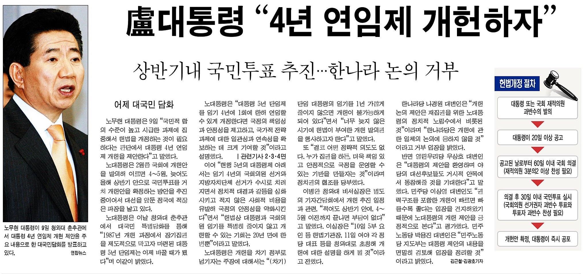 변론이 종료되자 대통령실 대변인실은 언론 공지를 통해 "윤석열 대통령은 어제 헌법재판소 탄핵심판 최후진술에서 임기 단축 개헌 추진, 국민통합 그리고 총리에게 국내 문제 권한 대폭 위임 등의 뜻을 밝혔다"며 "대통령의 개헌 의지가 실현돼 우리 정치가 과거의 질곡에서 벗어나 새로운 시대를 열기를 희망한다"는 입장을 밝혔고, 여권의 고위 관계자는 "1987년 개헌 시 헌법 개정 선언 후 4개월이 걸렸다"며 "여야가 열린 마음으로 개헌 작업에 나선다면 빠른 시간 안에 개헌이 가능하다"고 말했죠.