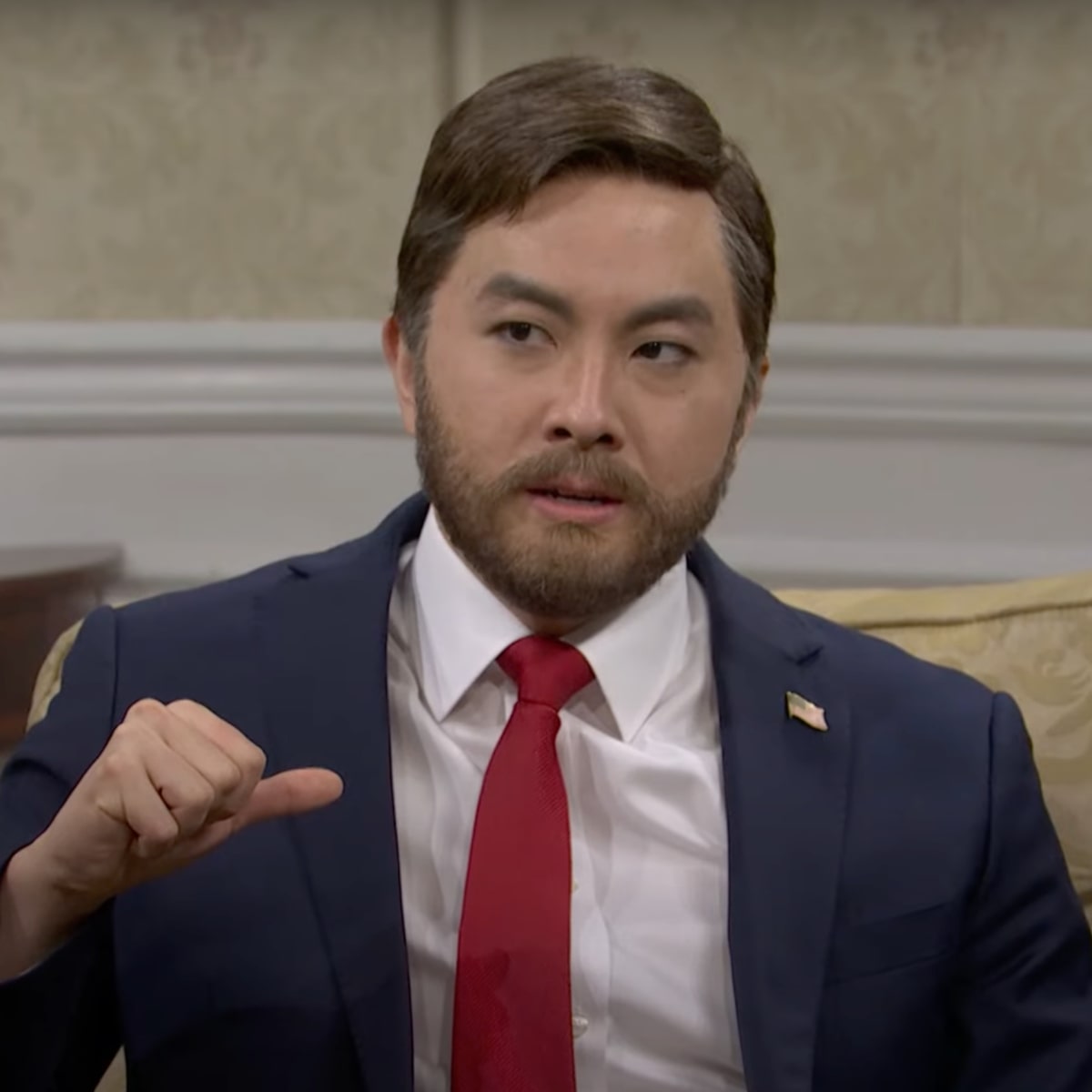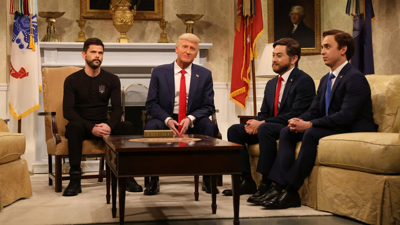당황한 젤렌스키 역의 배우가 다소 서툰 영어로 무언가 말을 시작하려 하자, 밴스 역 배우는 이를 가로막으며 "잠깐 끼어들어야겠다. '감사합니다'는 어떻게 된 거냐. 당신은 지금 15초 동안 '감사합니다'라고 말하지 않았다"고 극 중 젤렌스키를 거듭 다그쳤습니다. 이는 밴스 부통령이 젤렌스키 대통령에게 "무례하다"며 "미국과 트럼프 대통령을 향해 감사함을 표시해라"고 반복해 말한 것을 풍자한 것.