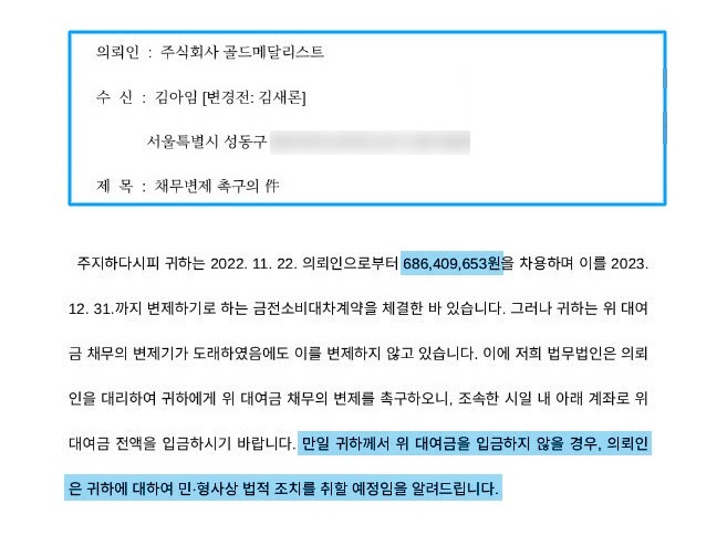 골드메달리스트 "내용증명은 형식상 절차"... 하지만 김새론은 불안에 떨었다