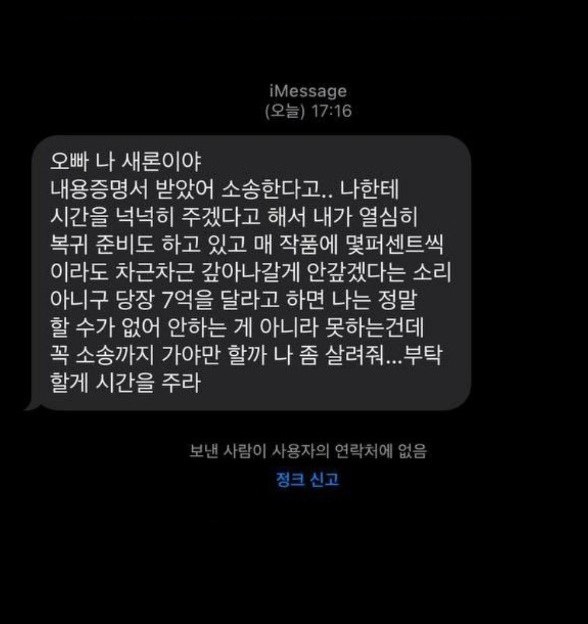 뿐만 아니라 故 김새론 유족 측이 제공한 한 문자메시지 스크린샷도 논란이 되고 있습니다. 김새론은 김수현에게 "오빠 나 새론이야, 내용증명서 받았어 소송한다고"라며 "나한테 시간을 넉넉히 주겠다고 해서 내가 열심히 복귀 준비도 하고 있고 매 작품에 몇 퍼센트 씩이라도 차근차근 갚아 나갈게"라고 호소했습니다. 또한 "안 갚겠다는 소리 아니고 당장 7억원을 달라고 하면 나는 정말 할 수가 없어. 안 하는 게 아니라 못하는 건데 꼭 소송까지 가야만 할까"라고 부탁하며 "나 좀 살려줘. 부탁할게. 시간을 주라"라고 거듭 호소했죠.