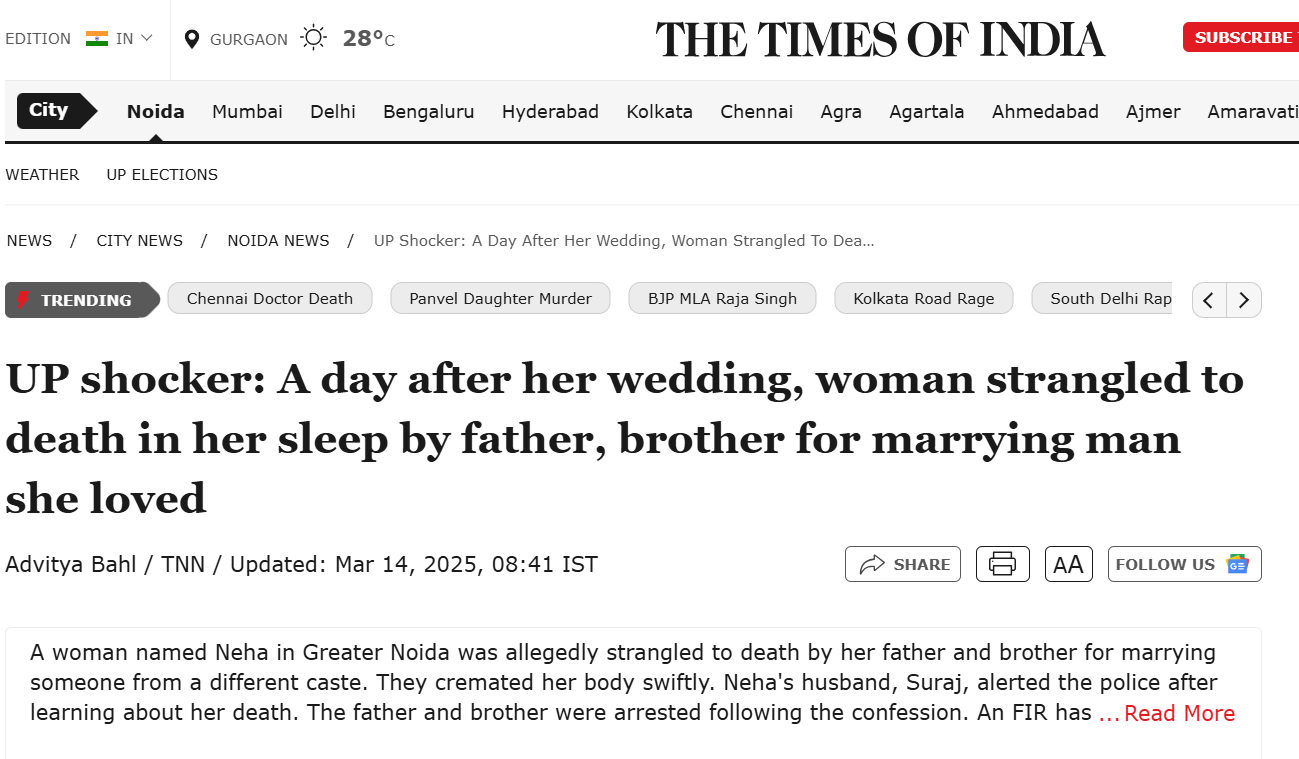 인도에 살다보면 이러한 소식을 주기적으로 접할 수 있습니다. 지난달에도 같은 우데르프라데시 주의 라릿푸르에서 가족들의 반대를 무릅쓰고 교제를 이어온 22세 미툰 쿠슈와하(Mithun Kushwaha)와 19세 카미니 사후(Kamini Sahu)를 여성의 가족들이 독을 먹이고 목을 졸라한 사건도 있었죠. 여성의 가족들은 남자의 시신을 나무에 매달아 자살로 위장했고, 딸의 시신은 집 뒤에 버린 뒤 실종된 척 했다가 덜미를 잡힌 일이 있었습니다.