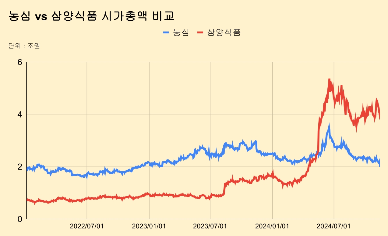 삼양식품의 2024년 영업이익은 전년 대비 133% 대폭 상승한 3,442억 원으로 1,631억 원을 기록한 농심을 사상 처음으로 앞지른 바 있습니다. 삼양식품의 시가 총액은 전날 종가 기준 6조8,399억 원으로 2조5,942억 원인 농심을 세 배 가까이 앞섰죠. 하지만 매출은 농심이 3조4,387억 원으로 삼양식품 1조7,300억 원보다 두 배 많습니다.
