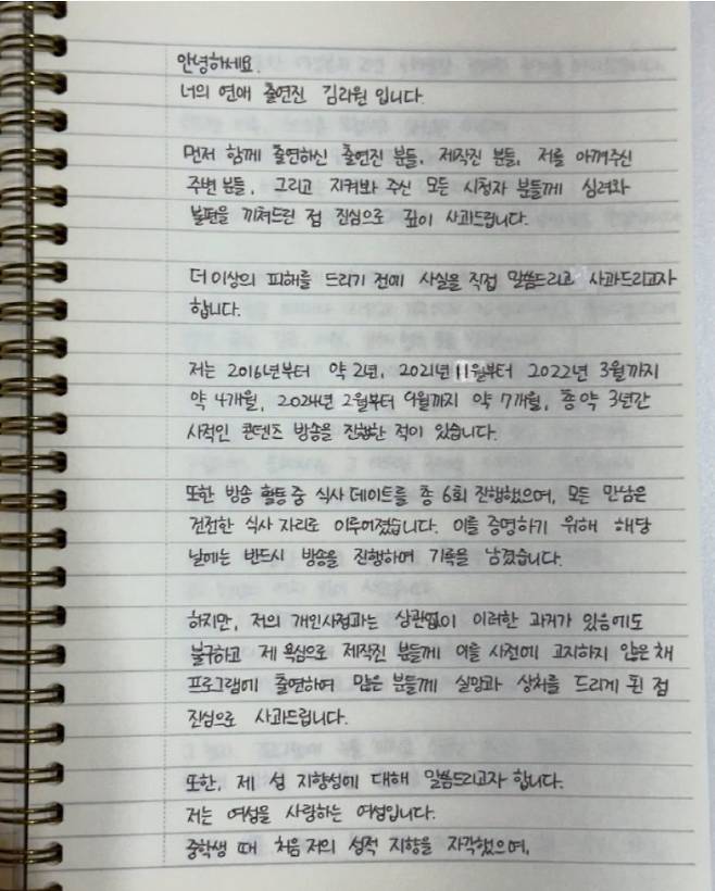 김리원은 "2016년부터 약 2년, 2021년 11월부터 2022년 3월까지 약 4개월, 2024년 2월부터 9월까지 약 7개월, 총 약 3년간 사적인 콘텐츠 방송을 진행한 적이 있다. 또한 방송 활동 중 식사 데이트를 총 6회 진행했으며, 모든 만남은 스킨십 없이 건전한 식사 자리로 이루어졌다"라며 "이러한 과거가 있음에도 불구하고 제 욕심으로 제작진 분들께 사전에 고지하지 않은 채 프로그램에 출연하여 사과드린다"라고 전했습니다.