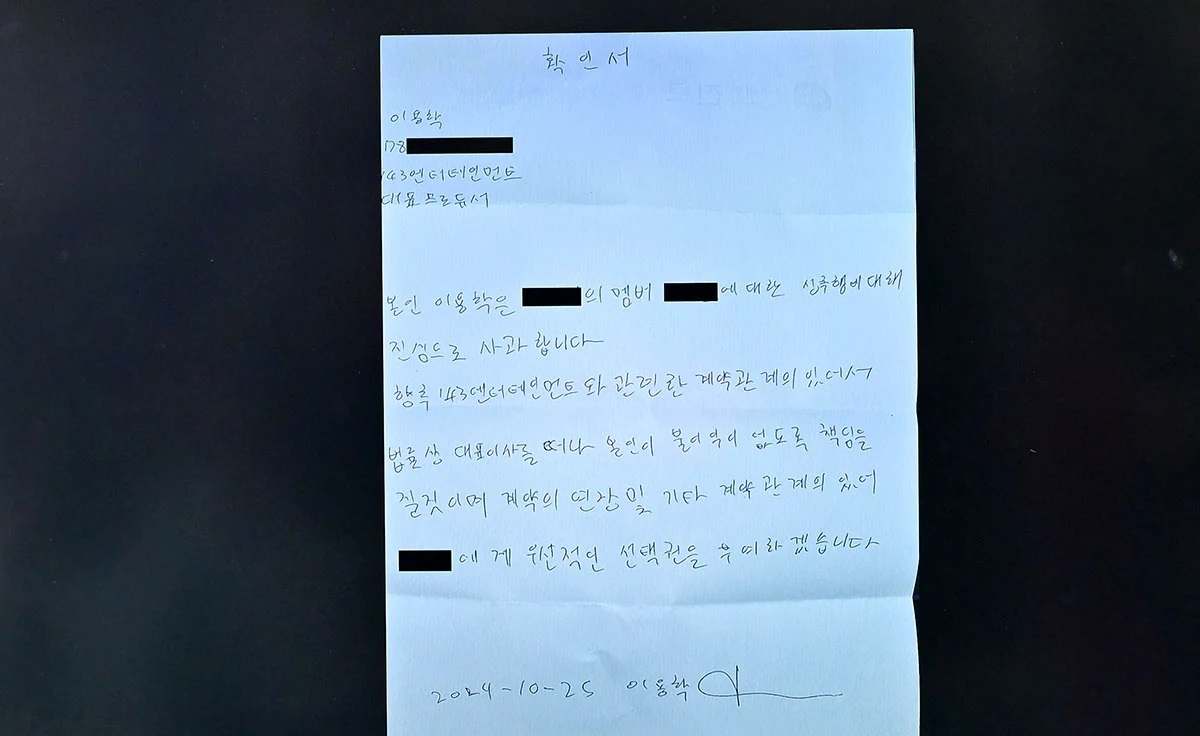 이날 한빛미디어노동인권센터 김영민 센터장은 현장에서 이용학 대표가 가은의 추행을 인정하는 대용이 담긴 자필 문서를 공개하기도 했습니다. 해당 문서에는 "본인 이용학은 멤버에 대한 성추행에 대해 진심으로 사과합니다"라며 "향후 143엔터테인먼트와 관련한 계약 관계에 있어서 법률상 대표이사를 떠나 본인이 불이익이 없도록 책임을 질 것이며, 계약의 연장 및 기타 계약 관계에 있어 우선적인 선택권을 부여하겠습니다"라는 자필 서약이 담겨있었죠. 또한 메이딘 멤버들의 부모들이 모인 자리에서 가은의 어머니 및 다른 부모들은 "아이들에게 한 행동은 범죄 아니냐"고 성추행 관련 추궁을 했고, 이와 관련해 이용학 대표가 "죄송하다"고 사과를 하는 녹취 일부가 공개되기도 했구요.
