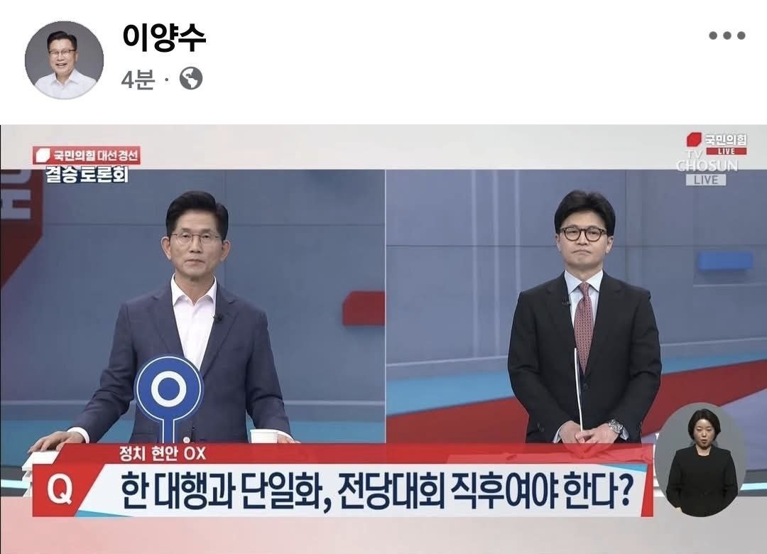 여섯 번째 상황은 김문수 후보가 사무총장으로 지명했던 장동혁 의원이 고사하면서 유임된 이양수 사무총장에 의해 일어났습니다. 이양수 사무총장은 자신의 페이스북에 과거 김문수 후보가 국민의힘 최종 경선 토론회에서 '전당대회 직후 단일화를 해야 하냐'는 질문에 김문수 후보가 'O' 팻말을 든 장면을 캡쳐해 올린 데 이어 "어느 법을 준용하더라도 후보자의 전권을 인정하는 경우는 없다"면서 "김문수 후보 측은 당헌당규위에 군림하려는 행위를 즉시 중단해야 한다"고 주장했죠.