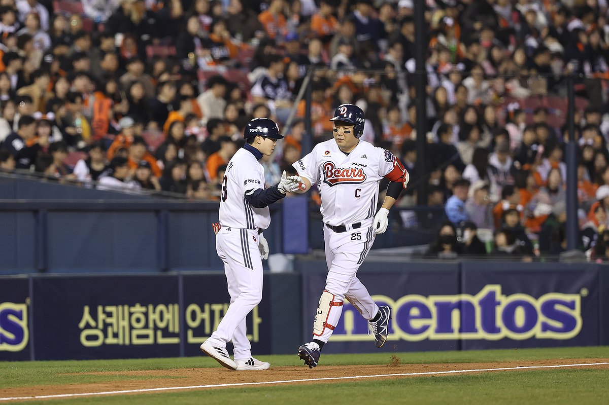 한화가 2회 1점을 가져왔지만, 두산은 3회 또 한 번의 달아나는 홈런으로 한화의 기세를 꺾었습니다. 3회 선두타자 양석환이 좌측 담장을 넘어가는 홈런을 쳤고, 결국 엄상백을 강판시켰습니다. 한화의 타선은 침묵하는 사이 두산은 5회 양의지, 6회 강승호가 솔로 홈런을 날리며 달아났죠. 두산은 선발 최승용이 좌측 중지 손톱이 깨져 3회 마운드에 오르지 못했지만 박정수가 호투를 펼치며 마운드를 지켰고, 박정수가 내려간 이후엔 박신지가 2이닝을 무실점으로 막았습니다. 그리고 9회 2사 1, 2루서 양의지가 쐐기 적시타를 뽑아냈습니다. 9회말엔 신인 투수 양재훈이 올라와 프로 데뷔전을 가졌고, 선배들과 마찬가지로 무실점으로 이닝을 틀어막으며 팀에 승리를 가져다줬죠.