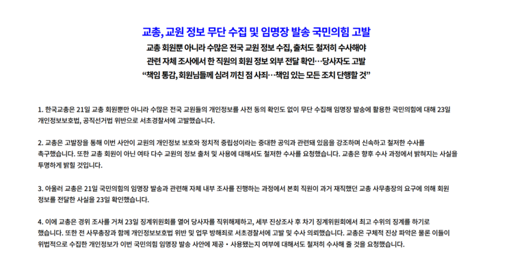 23일 교총은 보도자료를 내고 "국민의힘의 임명장 발송과 관련해 자체 내부 조사를 진행하는 과정에서 본회 직원이 과거 재직했던 교총 사무총장의 요구에 의해 회원 정보를 전달한 사실을 23일 확인했다"고 밝혔습니다. 교총은 "경위 조사를 거쳐 징계위원회를 열어 당사자를 직위해제하고, 세부 진상조사 후 차기 징계위원회에서 최고 수위의 징계를 하기로 했다"며 "또한 전 사무총장과 함께 개인정보보호법 위반 및 업무 방해죄로 서초경찰서에 고발 및 수사 의뢰했다"고 알렸죠.