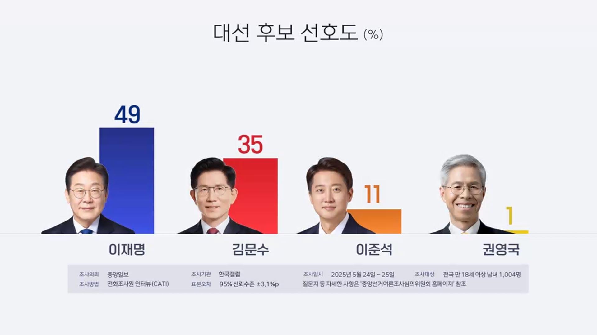 이준석 후보가 거론한 한국갤럽의 여론조사에 따르면 '보수 후보 단일화' 성사를 전제로 가상 양자 대결을 실시했을 경우에도 이재명 후보가 52%p를 얻어 42%인 김문수 후보와 10%p의 격차를 보인 반면 이준석 후보로 단일화가 될 경우에도 이재명 후보는 51%p를 얻어 40%인 이준석 후보에 11%p 앞선 것으로 나타났습니다. 하지만 이는 역시 말장난. 삼자대결로 가정했을 때는 이재명 후보 49%p, 김문수 후보 35%p, 이준석 후보 11%p로 이재명 후보가 오차 범위 밖으로 앞섰죠.