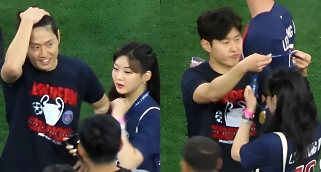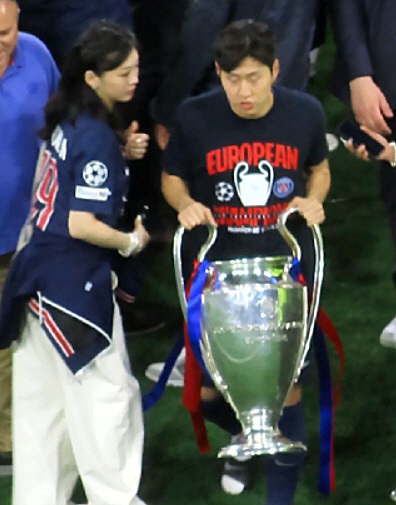 트로피 세리머니 후 PSG 선수단의 모든 가족들이 그라운드로 내려와 우승의 기쁨을 함께 만끽했고, 여기서 낯익은 사람이 눈에 띄었습니다. 바로 '두산가(家) 5세' 박상효 씨. 이강인은 박씨에게 우승 메달을 목에 걸어주기도 하고 UCL 우승 트로피인 빅이어 앞에서 함께 기념 사진을 찍기도 했습니다.