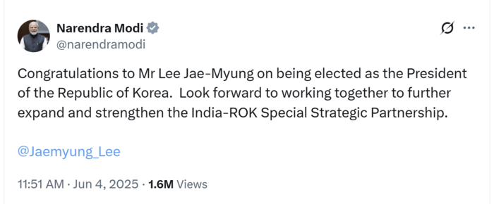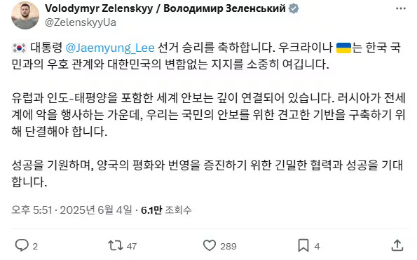 그 외에도 나렌드라 모디 인도 총리가 X를 통해 "이재명 대통령의 대한민국 대통령 당선을 축하한다"며 "한-인도 특별 전략적 동반자 관계를 더욱 확대하고 강화해 나가기위해 함께 협력해 나가기를 기대한다"고 밝힌 것을 비롯해 안토니우 코스타 유럽연합(EU) 상임의장이 X에 "당선을 축하한다"며 "핵심 동망으로서 우리의 전략적 파트너십을 심화하기를 기대한다"고 글을 썼고, 볼로디미르 젤렌스키 우크라이나 대통령은 X에 한글로 "선거 승리를 축하한다. 우크라이나는 한국 국민과의 우호 관계와 대한민국의 변함없는 지지를 소중히 여긴다"며 "성공을 기원하며, 양국의 평화와 번영을 증진하기 위한 긴밀한 협력과 성공을 기대한다"고 글을 올렸습니다. 대만 외교부도 입장문을 통해 "우리나라(대만) 정부를 대표해 한국 정부와 인민에 다시금 민주 선거를 마친 것에 진심 어린 축하를 전한다"며 "우리나라는 긴밀하고 단단한 상호작용 기초 위에서 한국 새 정부와 영역별 협력 관계를 지속 심화하고, 인도·태평양 지역의 평화·안정과 번영을 함께 촉진하기를 기대한다"고 덧붙였죠.