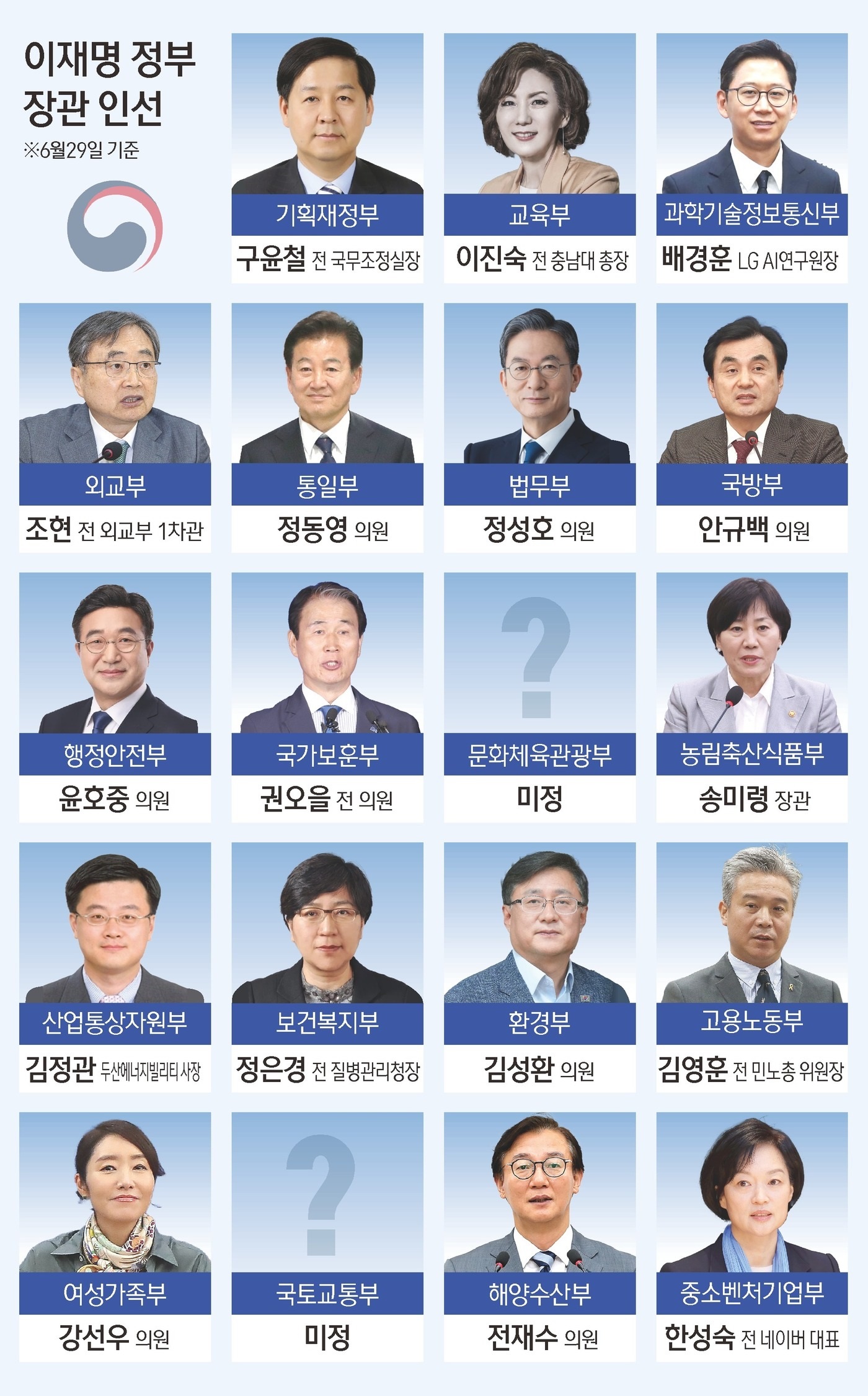 현재 이재명 정부 1기 내각 장관 후보자에 지명된 현직 의원은 총 8명입니다. 전날 국회에서 임명동의안이 가결된 김민석(4선) 국무총리를 비롯해 정동영(5선) 통일부·정성호(5선) 법무부·안규백(5선) 국방부·윤호중(5선) 행정안전부·김성환(3선) 환경부·강선우(재선) 여성가족부·전재수(3선) 해양수산부 장관 후보자가 있죠. 지금까지 발표된 총리 및 장관 후보자(18명)의 44.4%가 국회의원을 겸직하는 것이죠. 이는 1998년 출범 당시 현역 의원 10명을 내각에 발탁했던 김대중 정부 이후 역대 최대 규모입니다.
