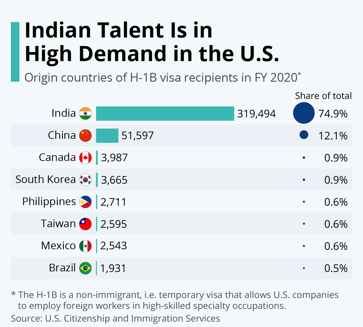 미국 이민서비스청 통계에 따르면 지난해 말 기준 H-1B 비자 소지자 가운데 인도 국적자가 약 71%(28만3,397명)로 가장 많았고, 중국(4만6,680명·12%), 필리핀(5,248명), 캐나다(4,222명), 한국(3,893명)이 뒤를 이었습니다. 그만큼 미국의 IT·금융·회계 분야에는 인도와 중국 출신 전문 인력이 폭넓게 포진해 있죠. 특히 IT 관련 일자리의 경우 80% 이상을 인도계가 차지하고 있다고 알려져 있습니다.
